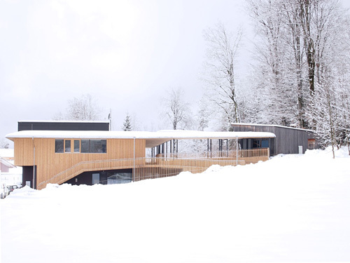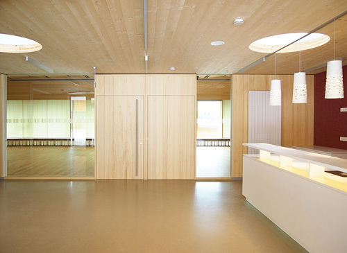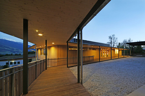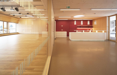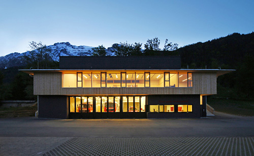 In dem aus dem Architekturwettbewerb hervorgegangene neuen Feuerwehr- und Vereinshaus von Manfred Gsottbauer sind die beiden unterschiedlichen Nutzungen wie im Vorgängerbau auf zwei Ebenen untergebracht. Ebenerdig zur Zufahrtsstraße hin orientiert befindet sich die Feuerwehrzentrale mit einer Fahrzeughalle sowie Technik- und Schulungsräume. Über diesem, zum Teil in den Hang eingegrabenen und komplett in Stahlbeton errichteten Bauteil liegt der in Holzbauweise ausgeführte Veranstaltungs- und Vereinstrakt mit einem großen, multifunktional nutzbaren Veranstaltungssaal, der sich über große Glasfronten zur umliegenden Landschaft öffnet. Zentraler Ort dieser Ebene ist das Foyer, um das sich alle Funktionen – u. a. eine Küche mit Ausschank und verschiedene, von den Vereinen nutzbare Räume – in offener Raumabfolge gruppieren. Der gesamte Veranstaltungsbereich ist innen und außen mit Holz (Weißtanne) getäfelt, im Foyer setzt die rotviolette Schankwand mit der weißen Ausschank einen frischen Kontrapunkt.