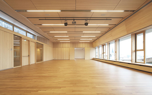 Niveaugleich an den Veranstaltungstrakt angeschlossen bildet der neugestaltete Platz das eigentliche Herzstück der Anlage. Umrahmt von der Bühne im Westen, dem überdachtem Vorplatz vor dem Foyer im Süden und einem Flugdach im Osten, das den Neubau mit der bestehenden „Buchenbar“ verbindet, entstand ein entsprechend aufgewerteter Festplatz, dessen gedeckte und offene Bereiche sich bestens dafür eignen, Treffpunkt und Veranstaltungsort für die unterschiedlichsten Anlässe im Dorfleben zu sein. (Text: Claudia Wedekind)
