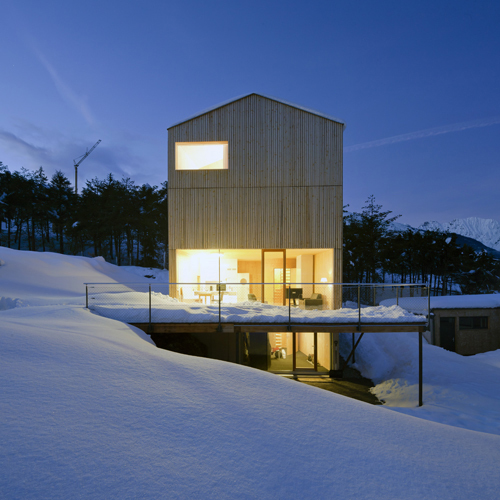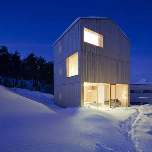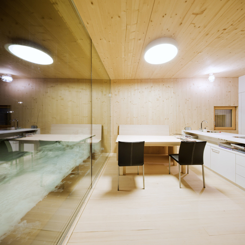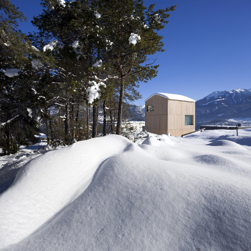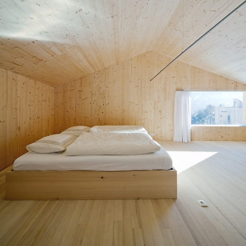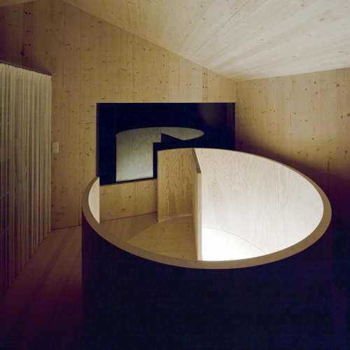 Auf ein halbes Untergeschoss, das neben dem Zugang auch die Technik birgt, stapeln sich drei Holzräume, die durch eine geschlossene hölzerne Wendeltreppe verbunden bzw. getrennt sind. Diese drei, in ihrem Grundriss identen Räume, sind Versuchsanordnungen, an denen exemplarisch die unterschiedliche Wirkung ablesbar ist, die durch Variation der Belichtung, der Aussicht, der Möblierung, der Raumhöhen und Raumabschlüsse bzw. der Aus- und Zugangsmöglichkeiten entsteht. Eine große Holzterrasse, eigentlich mehr eine Aussichtsplattform, erweitert den Wohnraum im Erdgeschoss nach Außen.