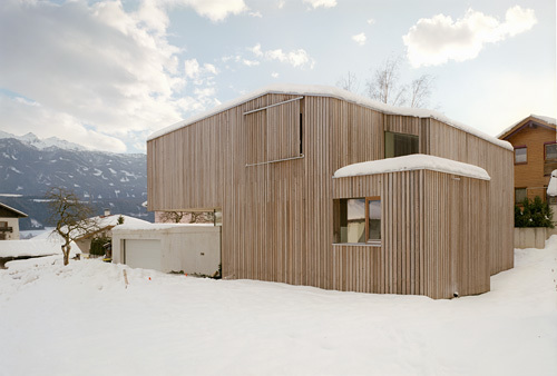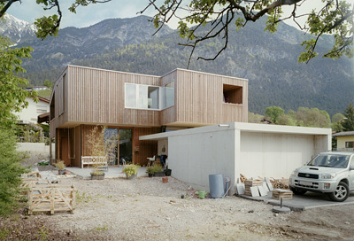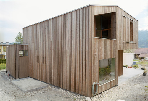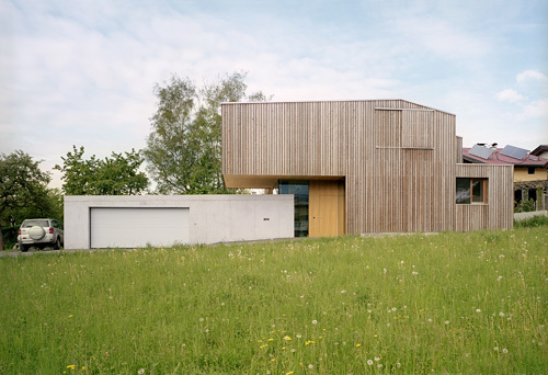 Das Einfamilienhaus gliedert sich in zwei Baukörper unterschiedlichen Charakters, einen rundum in Sichtbeton ausgeführten liegenden Kubus mit Garage und Wirtschaftsraum sowie einen zum Teil darüber auskragenden Holz-Glas-Bau mit asymmetrischem Satteldach sowie Vor- und Rücksprüngen, die u. a. ein geschütztes Entree und eine überdachte Terrassenflächen schaffen. Der in Massivholzbauweise errichtete Baukörper erhielt eine Fassade aus Lärchenholzbrettern, die durch eine spezielle Lasur eine schnelle, gleichmäßige Verwitterung erfahren. Charakteristische Elemente des Hauses sind Holzschiebeläden, die im Erdgeschoss untertags Sonnenschutz und bei Dunkelheit Sichtschutz bieten und im Obergeschoss für absolute Dunkelheit der Schlafräume sorgen. Im Südwesten ist dem Wohnraum eine großzügige Terrasse vorgelagert, die im Freien den Wohnbaukörper mit dem Garagenbauteil verbindet und einen abgegrenzten Bereich mit viel Privatsphäre schafft.