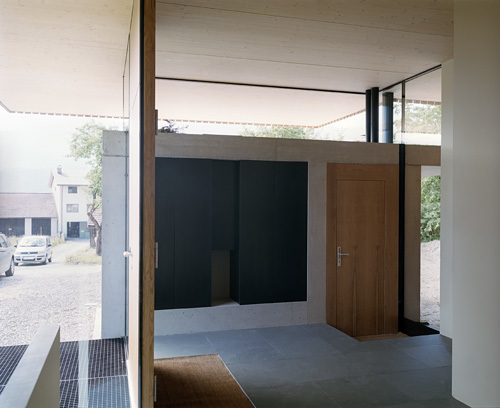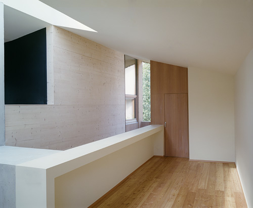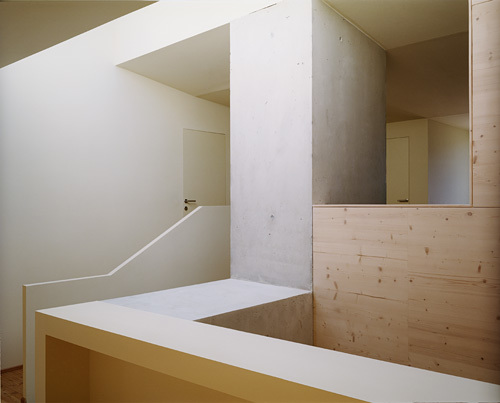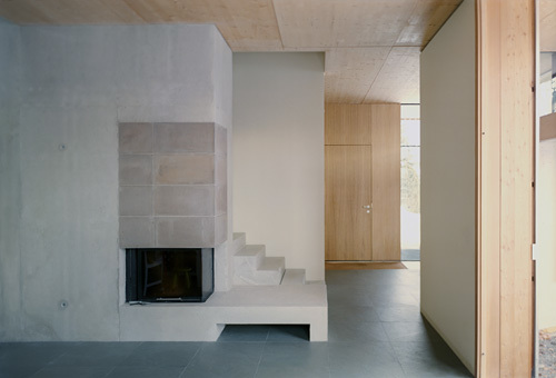 Zentrales Element im Inneren des Hauses ist ein skulpturaler, als tragendes Element für das Dach fungierender Sichtbetonkörper mit Ofen und Treppe. Um ihn angeordnet befinden sich Räume mit unterschiedlichen Höhen, Orientierungen und Ausblicksituationen. Im Erdgeschoss ist neben dem Wohnbereich, der sich über einen Luftraum in die oberen Geschosse fortsetzt, ein abgetrenntes, barrierefreies Gästezimmer mit eigener sanitärer Einheit untergebracht. Über eine Treppe erreicht man eine flexibel nutzbare Galerie mit einem geschützten Balkon im Westen. Über einen weiteren Treppenlauf gelangt man hinauf ins Schlafgeschoss, wo ostseitig der Bereich der Eltern untergebracht ist und westseitig jener der Kinder. Von dieser höchsten Ebene aus bietet sich ein unverbaubarer Panoramablick Richtung Süden. (Text: Architektin; redakt. bearbeitet von Claudia Wedekind)