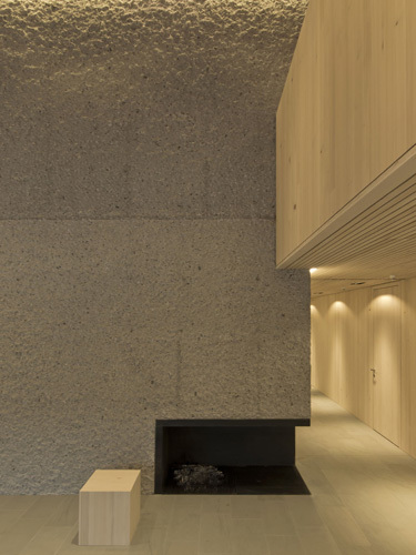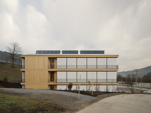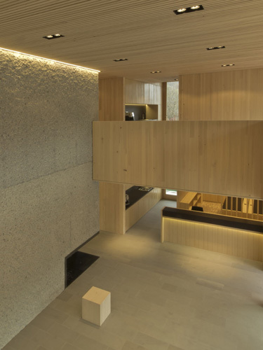 Die innere Struktur des Baukörpers folgt dem städtebaulichen Prinzip des Ensembles, in dem gleichwertige Büroeinheiten zu einem Körper zusammengefasst um einen mittig situierten Funktionskern platziert sind. In den Arbeitsbereichen schaffen gezielt eingesetzte dunkle Oberflächen einen eleganten Kontrast zur Weißtanne, welche nicht nur als konstruktiver Werkstoff zum Tragen kommt, sondern auch das Ausgangsmaterial für die Möbel bildet. Sichtbeton in rauer und glatter Ausführung bremst die etwaige rustikale Anmutung in den mit Weißtanne gestalteten Innenräumen. Die Büroeinheiten sind in allen Geschossen gleichwertig und bilden durch raumhohe Öffnungen einen fließenden Übergang auf die vorgelagerten gedeckten Balkone. Die Gesamterscheinung des Massivholzbaus folgt der Konzeption des „Einrückens“ der Büroeinheiten mit Ausbildung der Balkone. Dadurch entsteht eine Tektonik innerhalb der Kubatur, welche die strenge Form aufbricht, ohne dabei die Vorteile einer kompakten Bauform zu negieren. (Text: Architekt, redaktionell überarbeitet und erweitert Martina Frühwirth)