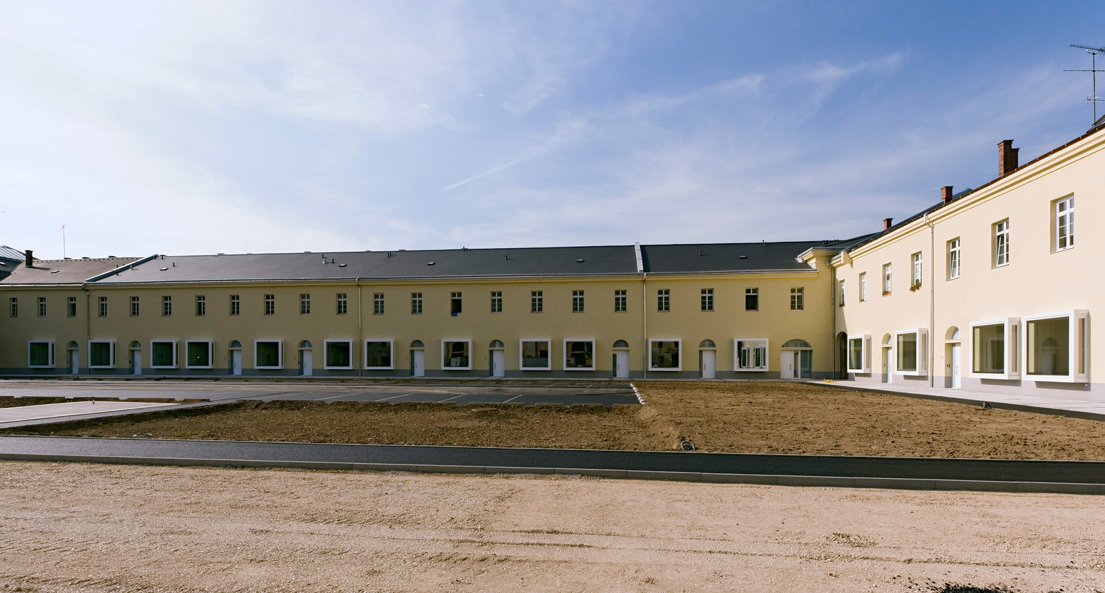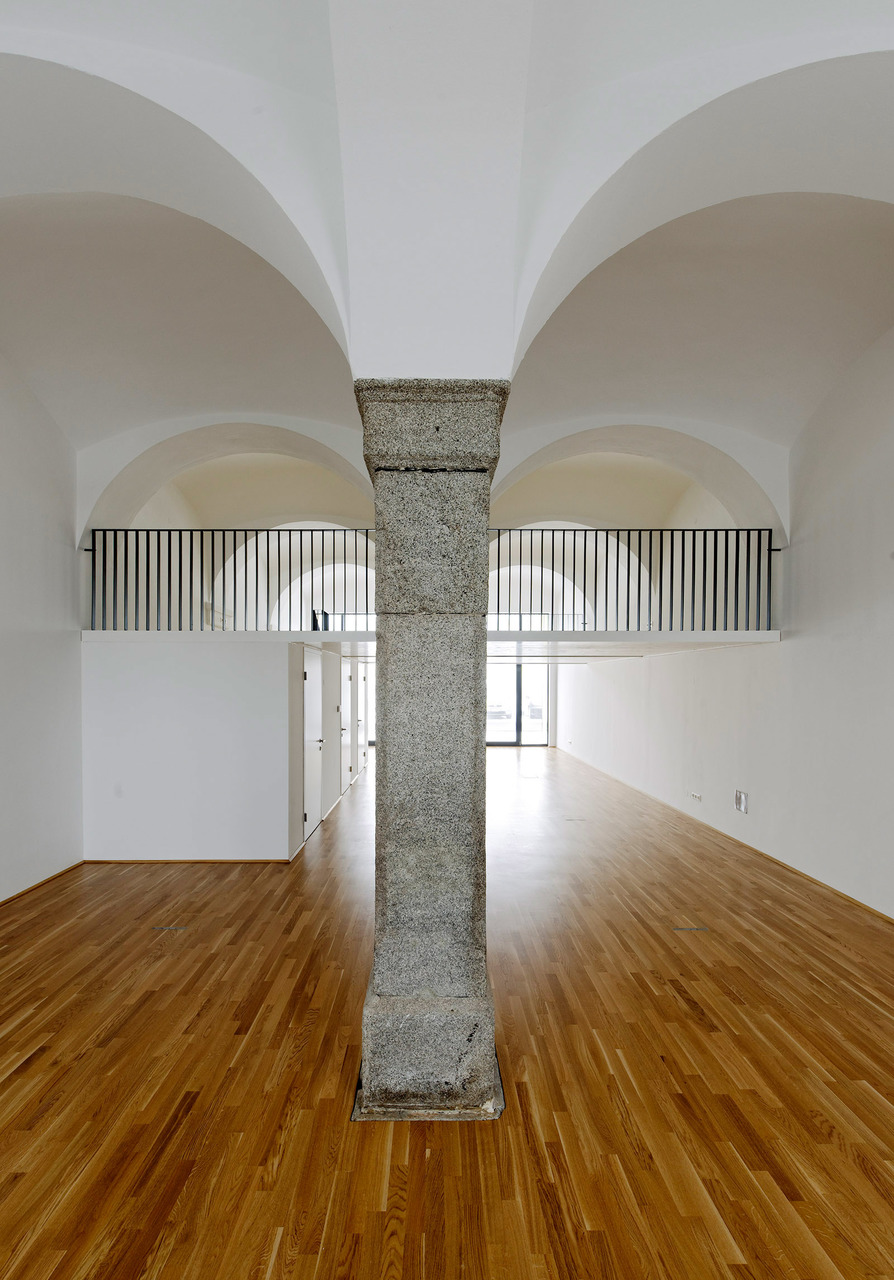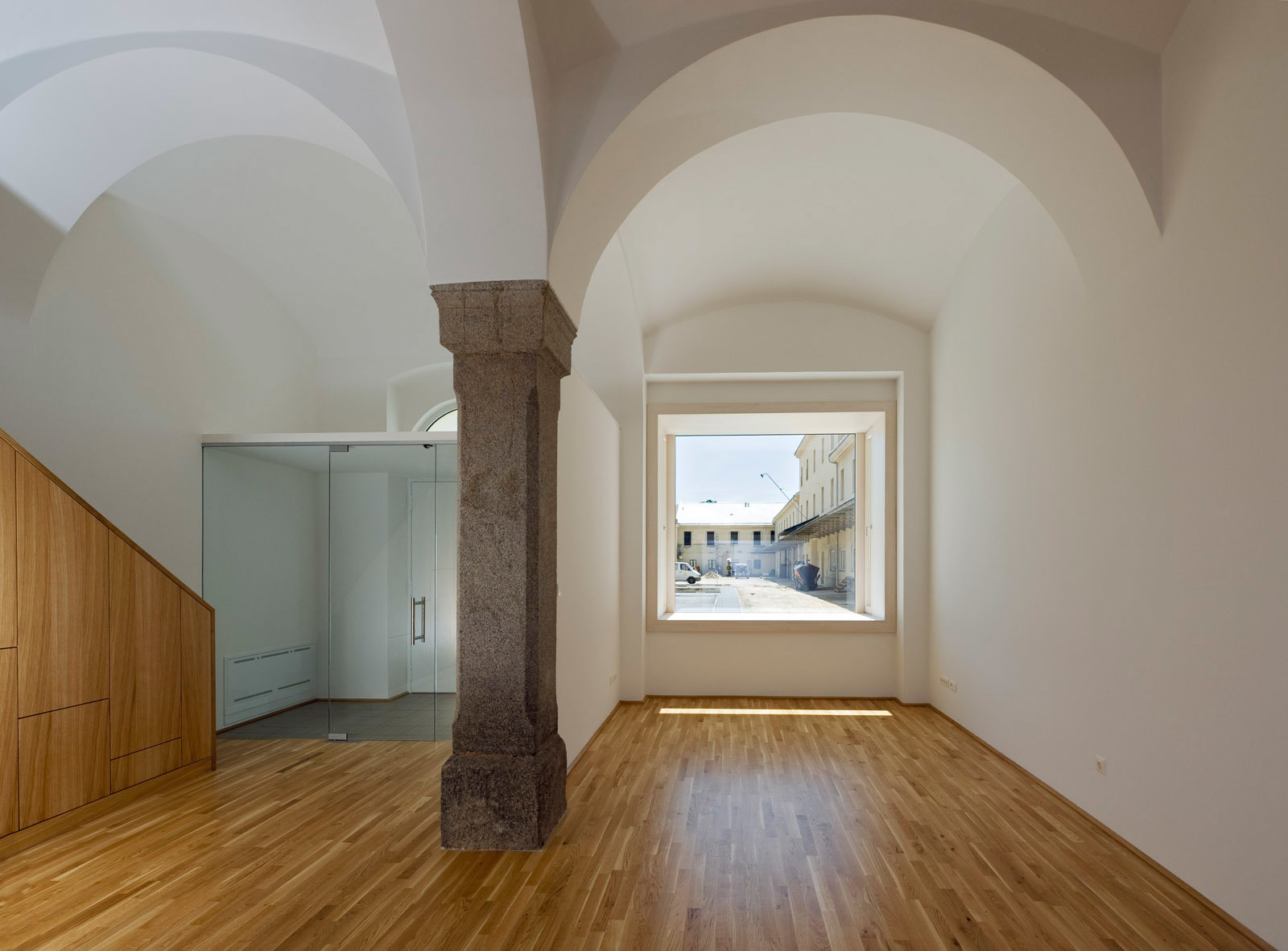 Die großen Öffnungen zum Hof resultieren aus bereits ausgebrochenen Garagenöffnungen des Vornutzers und schaffen der neuen Nutzung entsprechende Lichtverhältnisse.