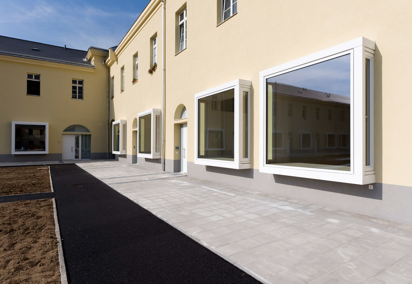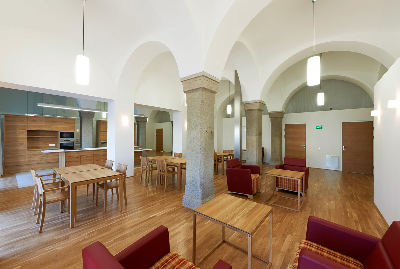 Der zweite Baustein umfasst den Einbau einer betreuten Wohngruppe für alte Menschen mit Demenz. Das Prinzip eines großen Einfamilienhauses mit entsprechenden Gemeinschaftsräumen sowie eigene kleine Wohneinheiten samt Sanitärräumen bildet das Raumgefüge. Bewusst wird durch die Verwendung von Naturholz ein angenehmes Raumklima geschaffen.