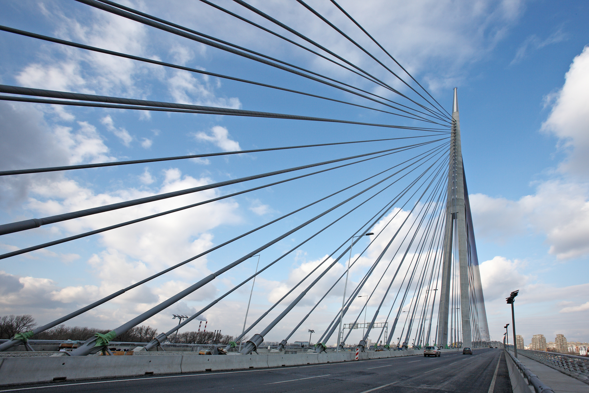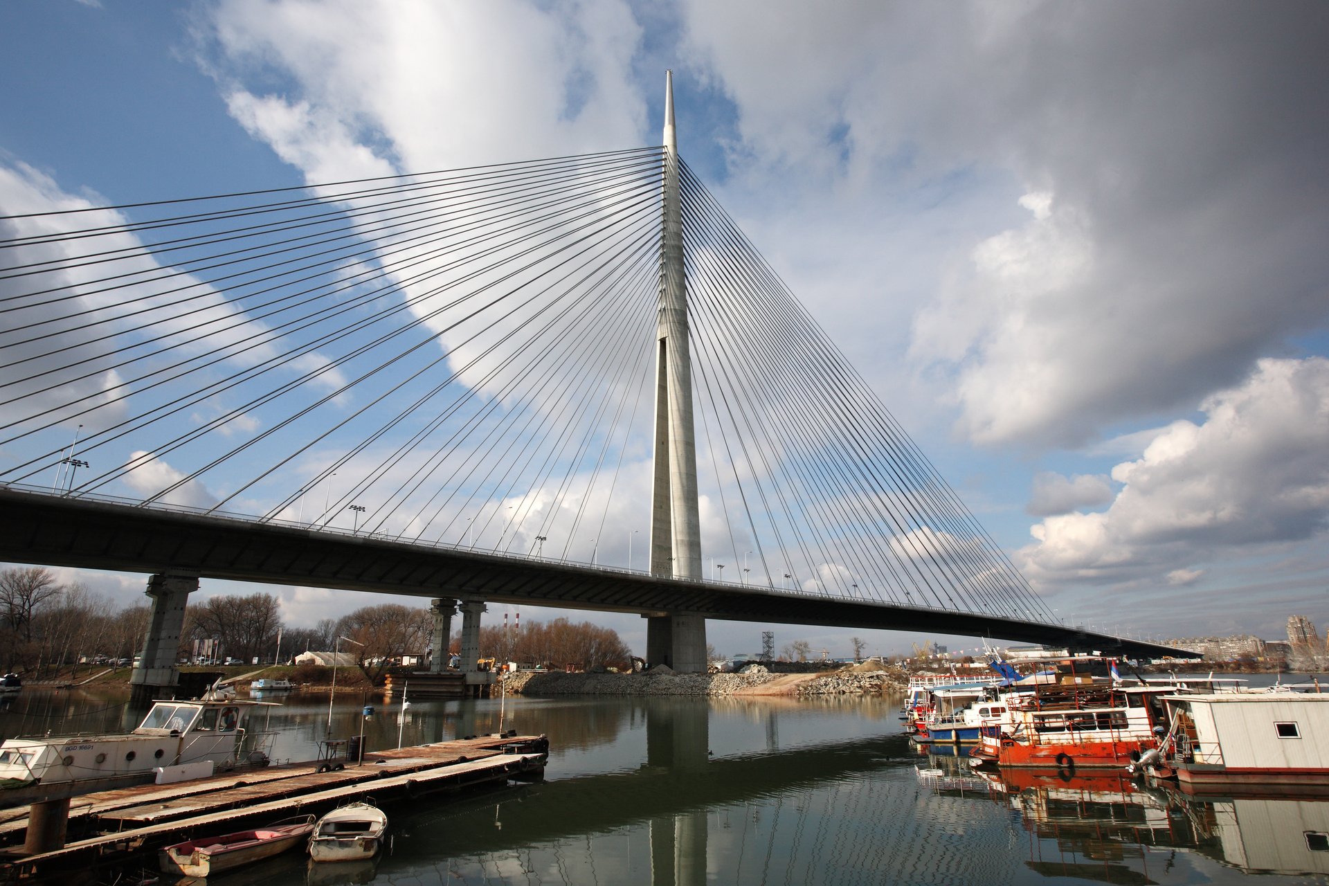 The Ada bridge, a cable-stayed structure with a 200 m high pylon connects the right Sava bank with New Belgrade. The bridge pylon rests on the tip of the peninsula Ada Ciganlija with a foundation depth of 40 m because of the sandy ground. The total length of the bridge is 964 m, the longest span 376 m. 45 m in width and 20 m above the river, three road lanes, a tram track and a pedestrian lane in each direction are positioned.