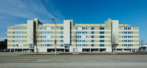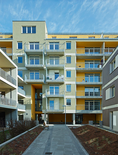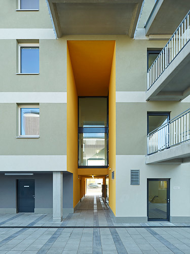 Dennoch verfügt die Wohnanlage über Atmosphäre, die mit Materialität verstärkt wird. So erzeugt die semitransparente Ausführung der Laubengänge zum Beispiel reizvolle Bilder, nämlich wenn Nachbarn beim Durchschreiten der Gänge als schemenhafte Schatten, die durch die Gänge wandeln, wahrgenommen werden.