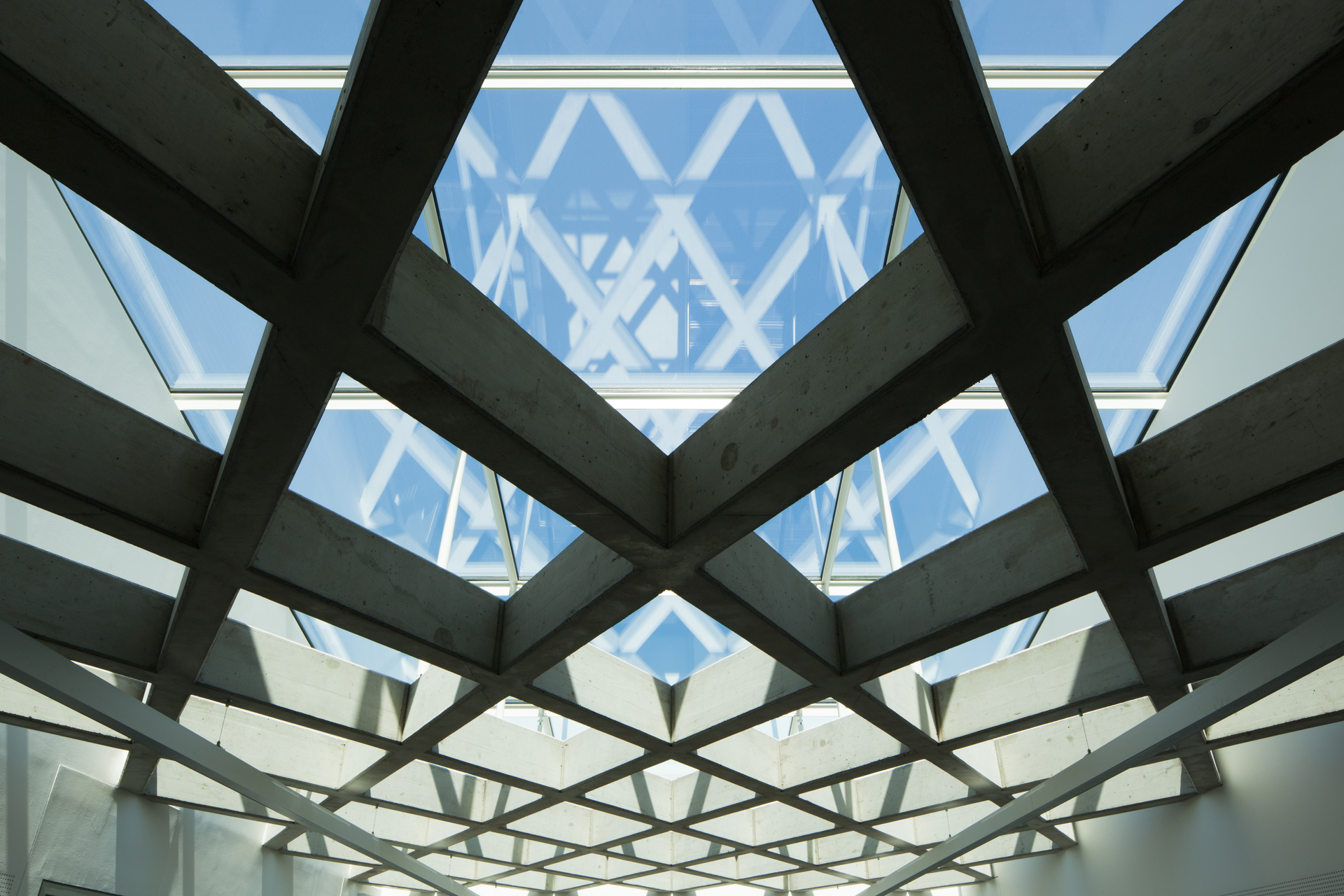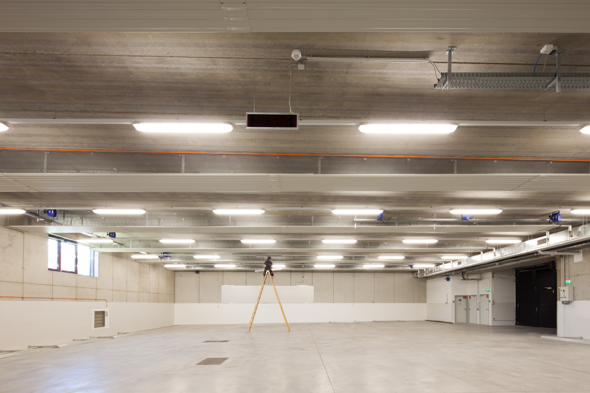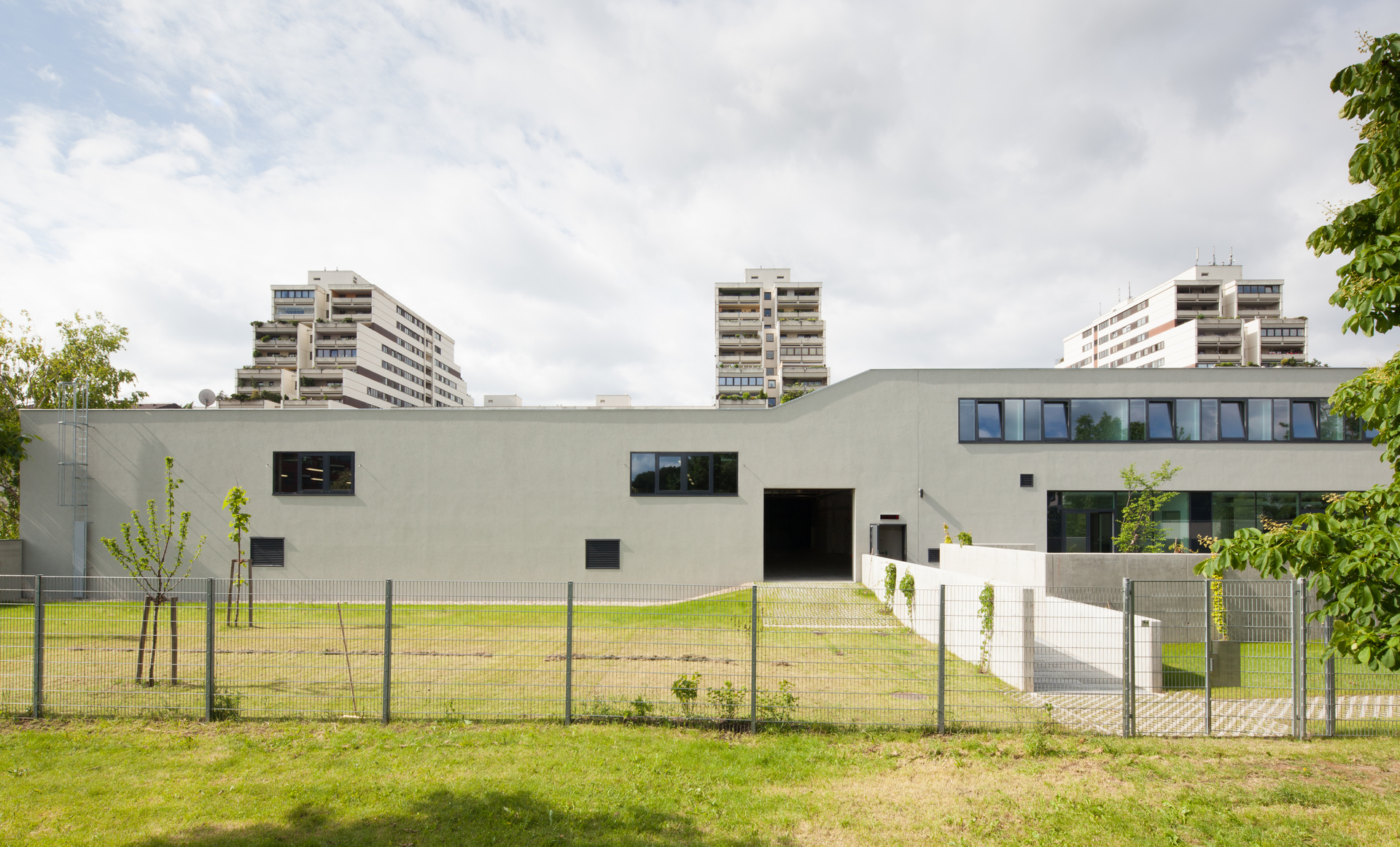 Zwei Funktionen – Garage und zweigeschossiger Personaltrakt – sind unter einem Dach zusammengefasst und bilden einen klar ablesbaren Baukörper, der sich südseitig, zur stark befahrenen Straße hin, beinahe hermetisch verschlossen zeigt. Ein Fassadenrücksprung markiert den Eingangsbereich, der direkt ins Atrium führt. Kaum dass die Türe ins Schloss gefallen ist, wird spürbar, dass das theoretische Konzept des Entwurfs in der Praxis voll aufgeht: Ruhe umgibt einen im Atrium, die lärmende Straße ist ausgeblendet. Dank Glasdecke ist der Innenraum auch an trüben Wintertagen in freundliches Licht getaucht. Rund um das Atrium angeordnet befinden sich im Erdgeschoss die Aufenthaltsräume, eine großzügige Gemeinschaftsküche mit direktem Zugang zum Garten, die Garderobenschleuse, die in die Garage führt, sowie die Stationsführung, von wo aus alle Abläufe im Haus wahrgenommen werden können. Die unmittelbare zentrale Anordnung der Räume um das Atrium ermöglicht kurze Wege und Gänge und reduziert die Ausrückezeiten auf ein Minimum. Eine Treppe führt in das erste Obergeschoss. Dort befinden sich die Ruheräumen, Garderoben sowie das Arztzimmer.