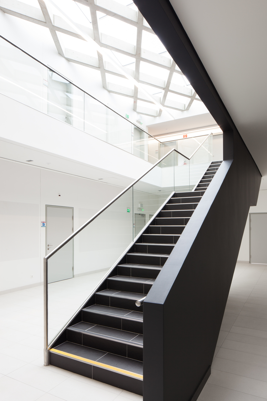 Die kurzen Wege wirken sich auch positiv auf die Brandschutzbestimmungen aus: da die Fluchtdistanz von jedem Raum bis zum Haupteingang weniger als 40 m beträgt, konnten Erd- und Obergeschoss als ein Brandabschnitt ausgeführt werden. Das ermöglicht eine offenere Gestaltung, die den Raum großzügiger wirken lässt. Auf eine barrierefreie Erschließung der Räume im Obergeschoss konnte verzichtet werden. Diese Räume sind den Mitarbeitern vorbehalten, die berufsbedingt uneingeschränkt mobil sein müssen. Die barrierefrei erschlossene Ambulanz hingegen befindet sich im Erdgeschoss. (Text: Martina Frühwirth nach einem Text der Architekten)