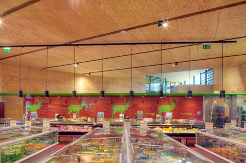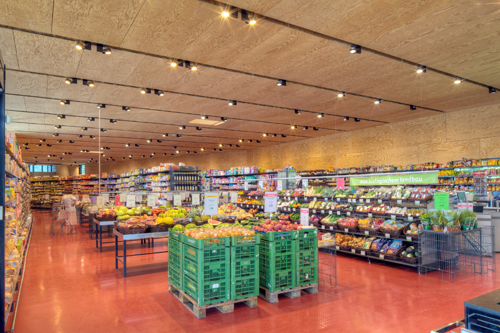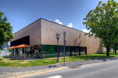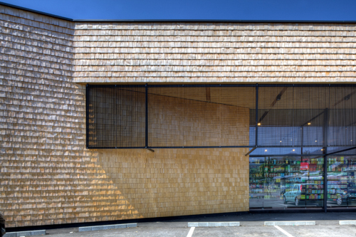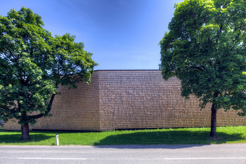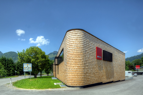 Die Außenwände wurden in Holzriegelbauweise ausgeführt und besitzen eine hinterlüftete Holzschindelfassade. Die Dachkonstruktion besteht aus vorgefertigten Kastenträgerelementen mir integrierter Wärmedämmung. Als Oberfläche von Wand und Decke wurde Seekiefersperrholz verwendet. (Text: Architekten)