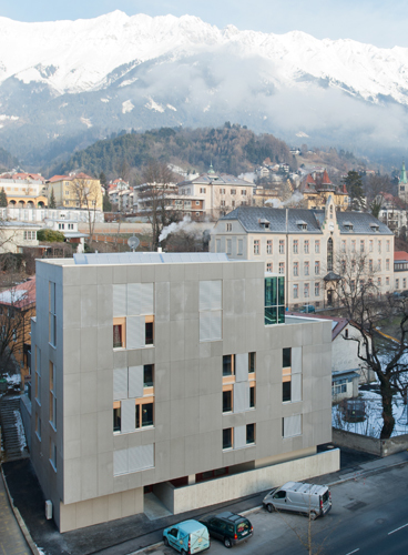 Im Erdgeschoss sind straßenseitig der Zugangsbereich mit Fahrradraum und das Parkdeck angeordnet. Auf den fünf weiteren Ebenen sind 16 Wohneinheiten untergebracht. Der kompakte Baukörper ist als Niedrigenergiehaus mit Kollektorflächen am Dach konzipiert.