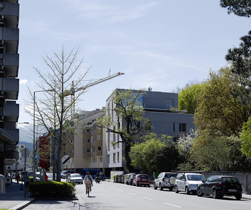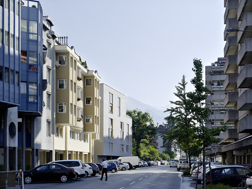 Der leicht aus der Flucht dieser Häuserfront ausgedrehte Baukörper reagiert auf den vorhandenen Knick im Straßenraum und nimmt Bezug auf die lange straßenseitige Einfriedungsmauer des großen angrenzenden Gartens. Die Abstufung des 6-geschossigen Hauses zu dieser östlich angrenzenden Gartenfläche und zum nördlichen Nachbarn schafft für die oberen Maisonettenwohnungen großzügige Terrassenflächen.
