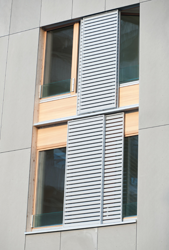 Zentrales Element für die Fassadengestaltung sind die großteils 2-geschossigen Fensterelemente im Raster der großflächigen Baueternitplatten. Insbesondere die Verwendung von Lärchenholzfenstern als Gegenstück zur schlichten betongrauen Fassadenplatte verleiht dem Gebäude sein charakteristisches Erscheinungsbild.