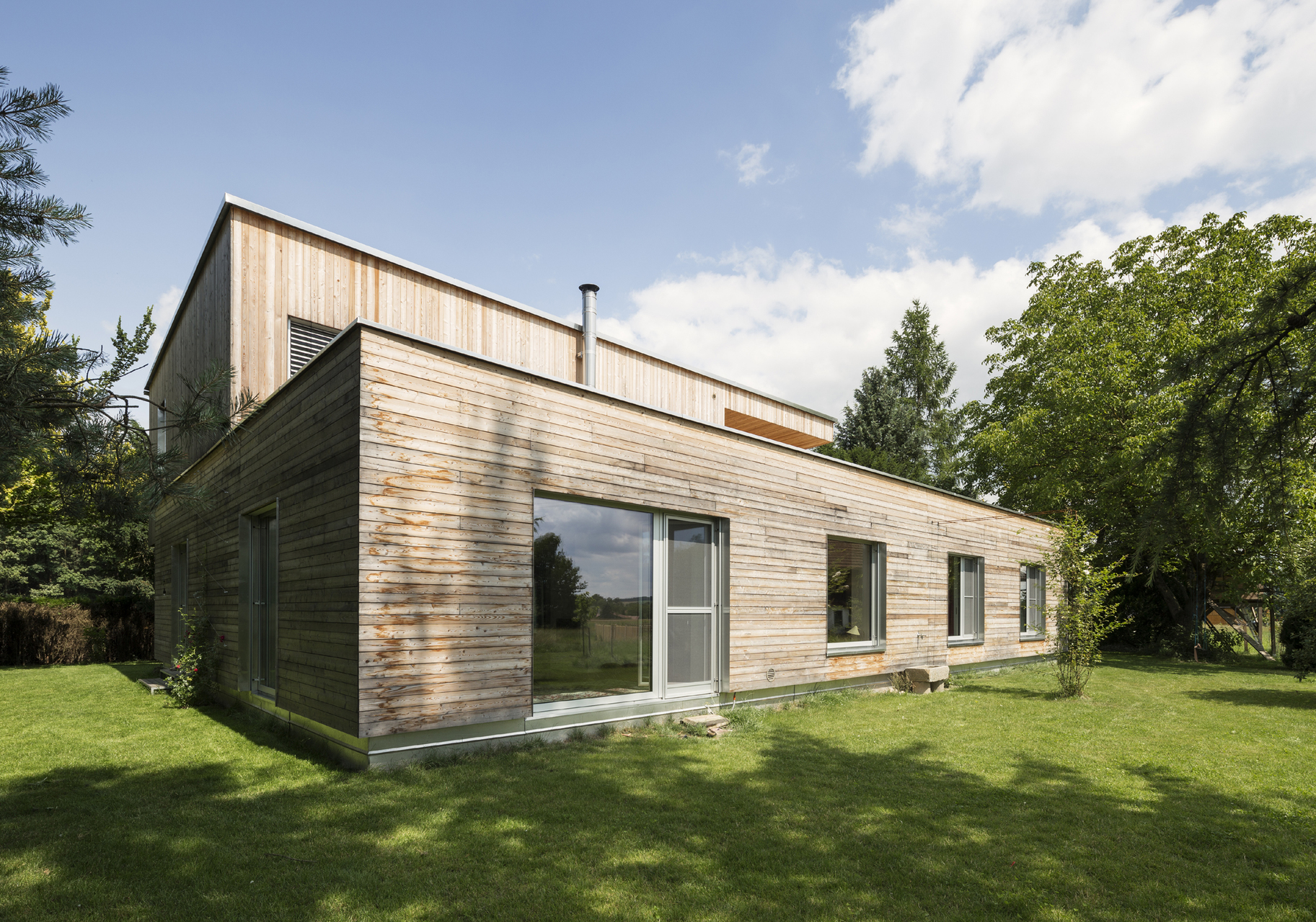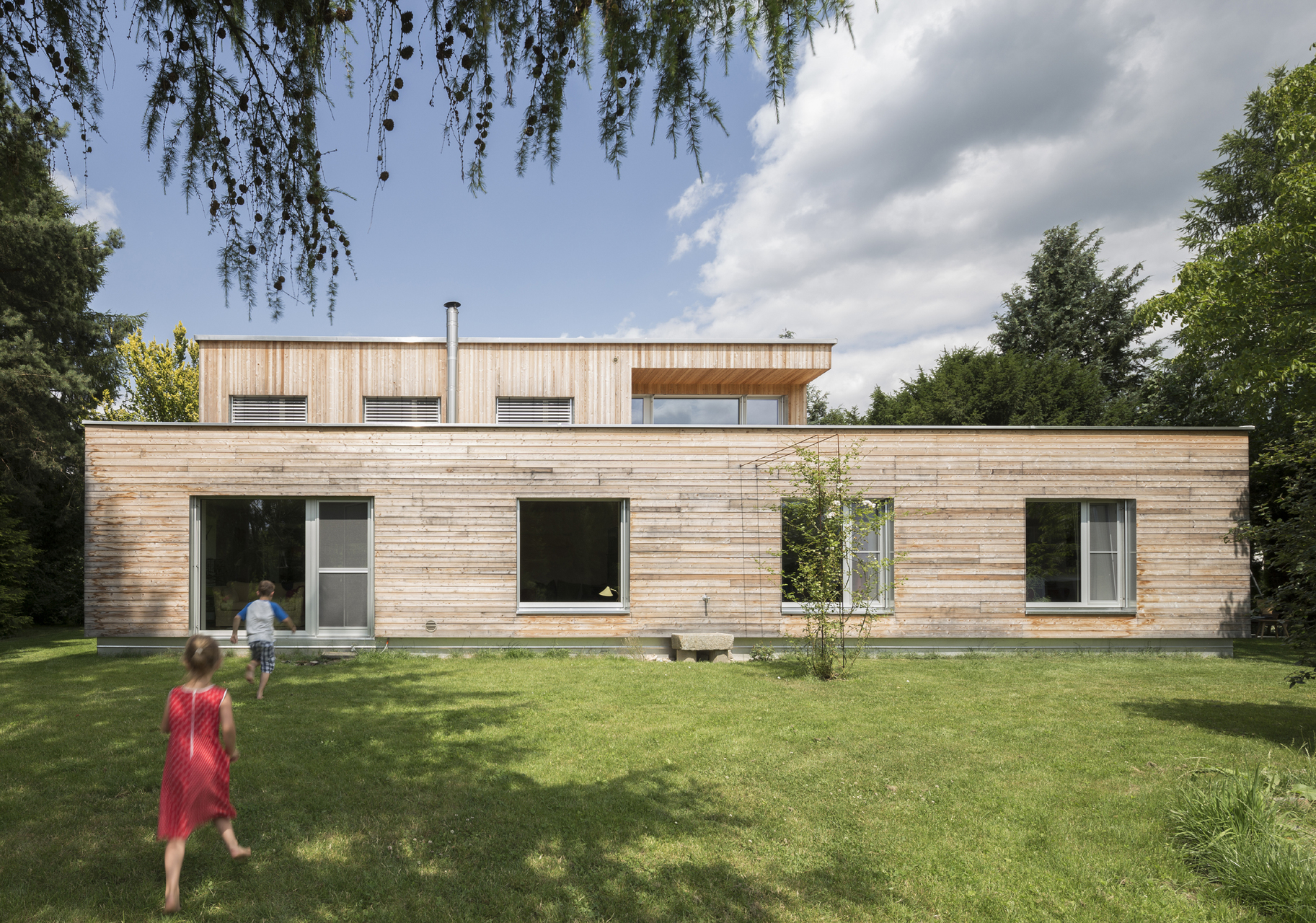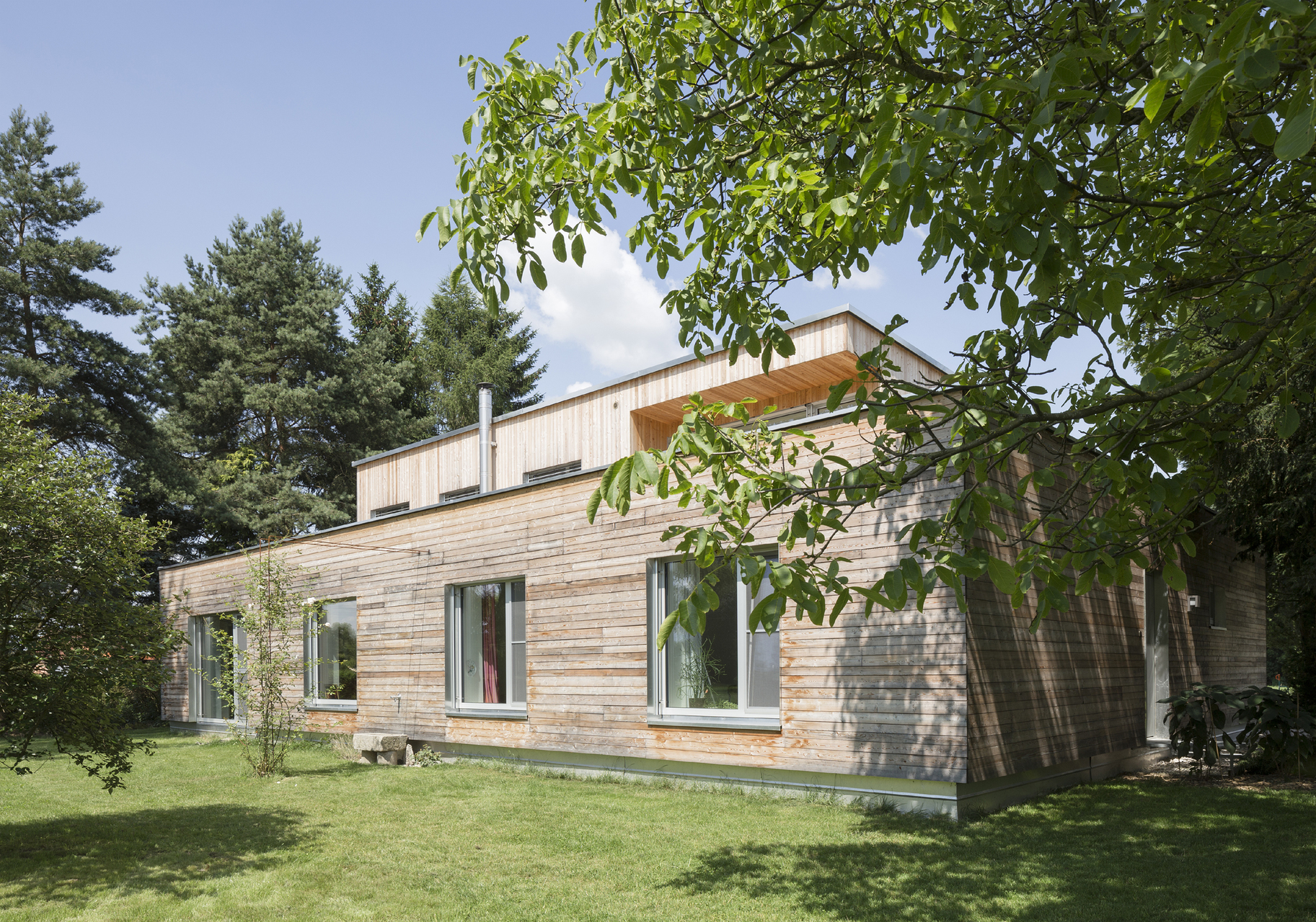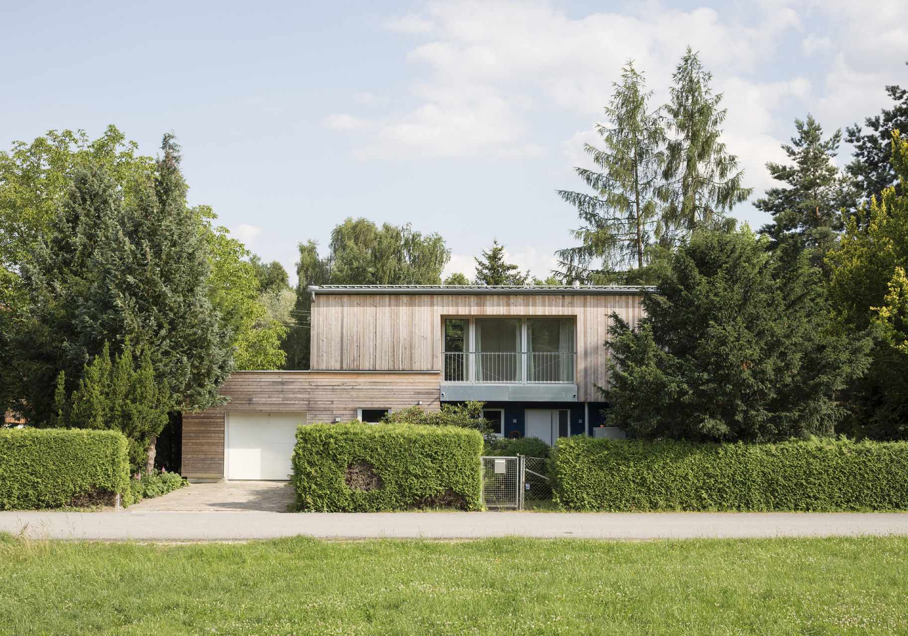 Durch die Ausbildung eines „Sockels“ scheint das Gebäude förmlich über der Erde zu schweben ohne dabei den umgebenden Naturraum zu beeinträchtigen. Auf Gartenebene schafft der dichte Baumbewuchs Geborgenheit und Intimität, im Obergeschoß gewährleistet dies der zurückspringende Gebäudekörper. Direkte Ausgänge, von den Schlafräumen führen auf die Flachdachterrasse und öffnen gleichzeitig einen ungestörten Blick in die umgebende Landschaft.