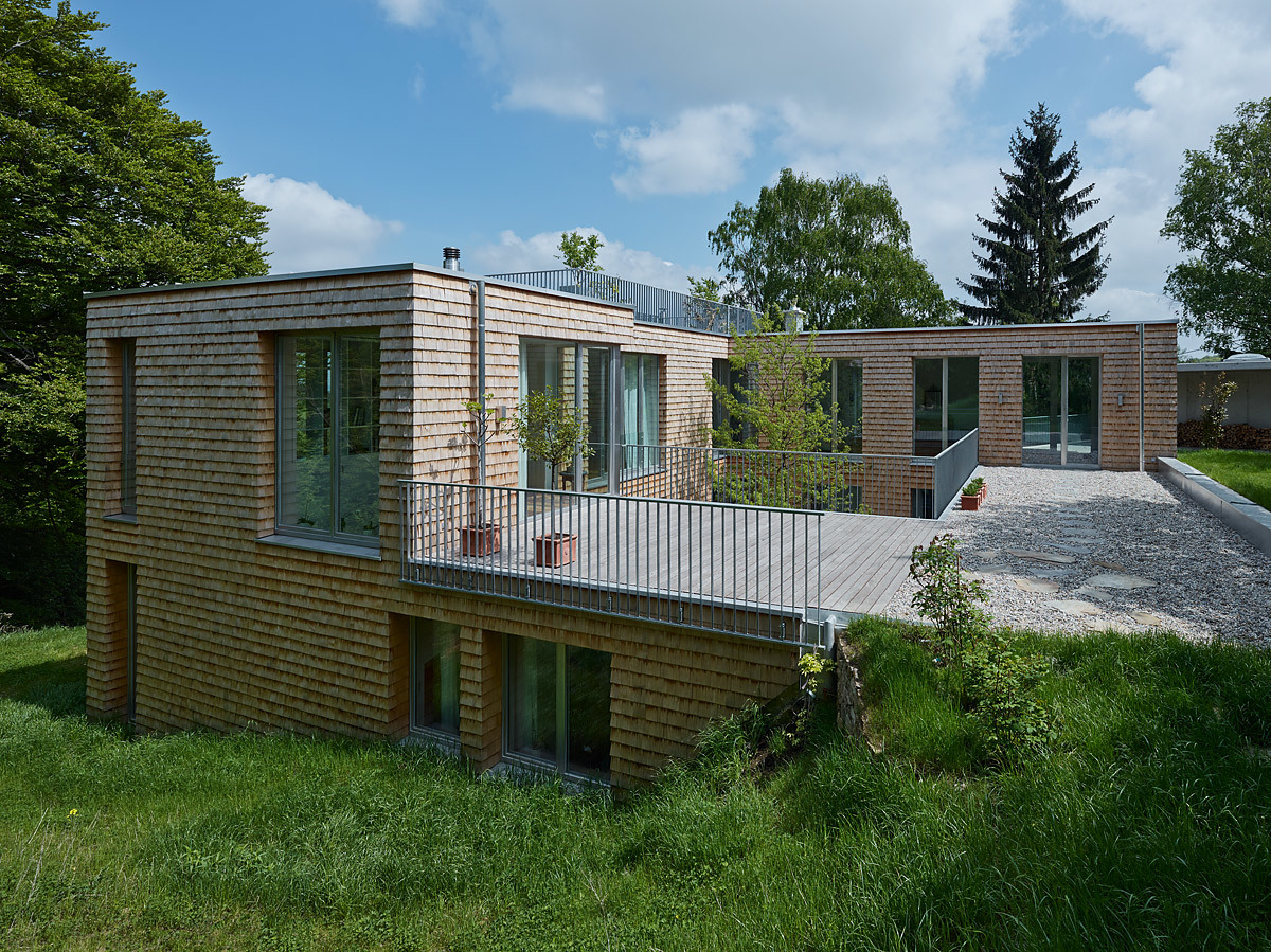 Der konstruktive Aufbau begründet sich aus seiner Lage im Hang: Alle äußeren umschließenden, erdberührten Außenwände des Untergeschosses sind in Stahlbeton ausgeführt. Die übrigen Wand-, Decken- und Dachkonstruktionen des Unter- und Erdgeschosses wurden in Holzbauweise ausgeführt und innerhalb von 5 Tagen errichtet. Die Dachlandschaft wurde als Flachdach mit Kieseindeckung ausgeführt. Neben der sehr gut gedämmten Gebäudehülle ist die Energieversorgung mittels Tiefenbohrung, Wärmepumpe und kontrollierter Wohnraumlüftung mit ein Grund für die Erreichung eines Niedrigenergiehausstandards mit einer EKZ von 39,6 kwh/m2a.