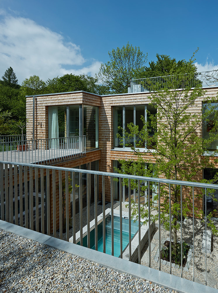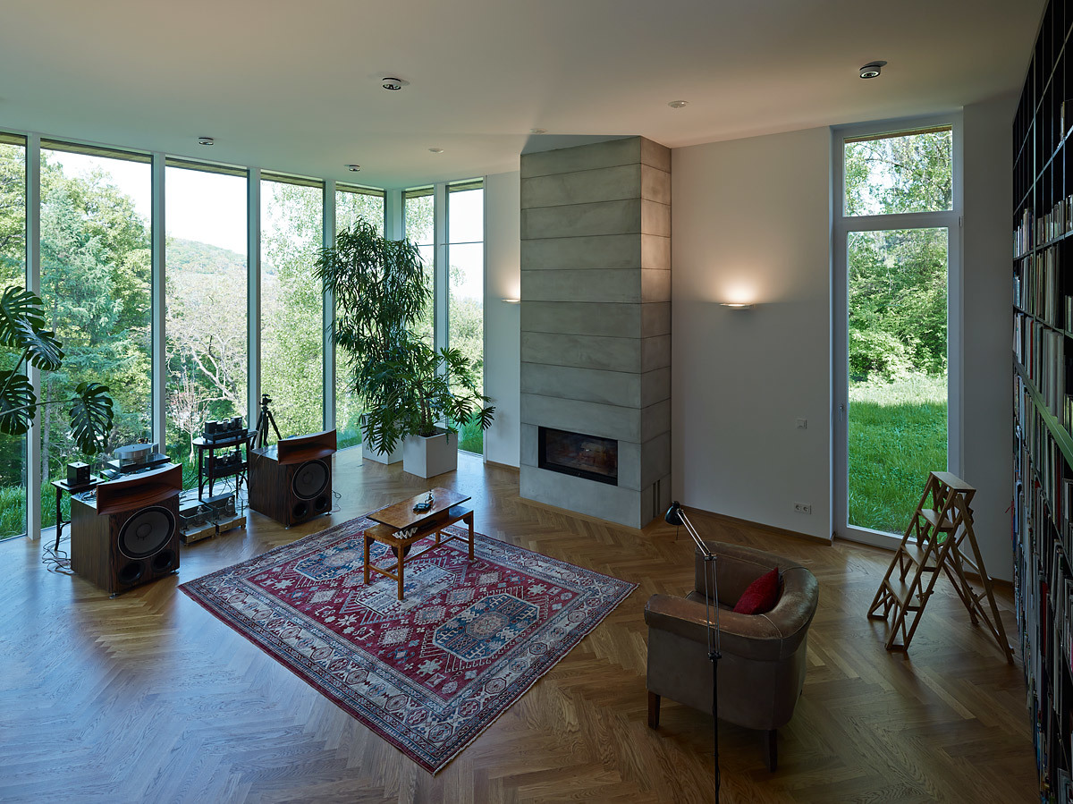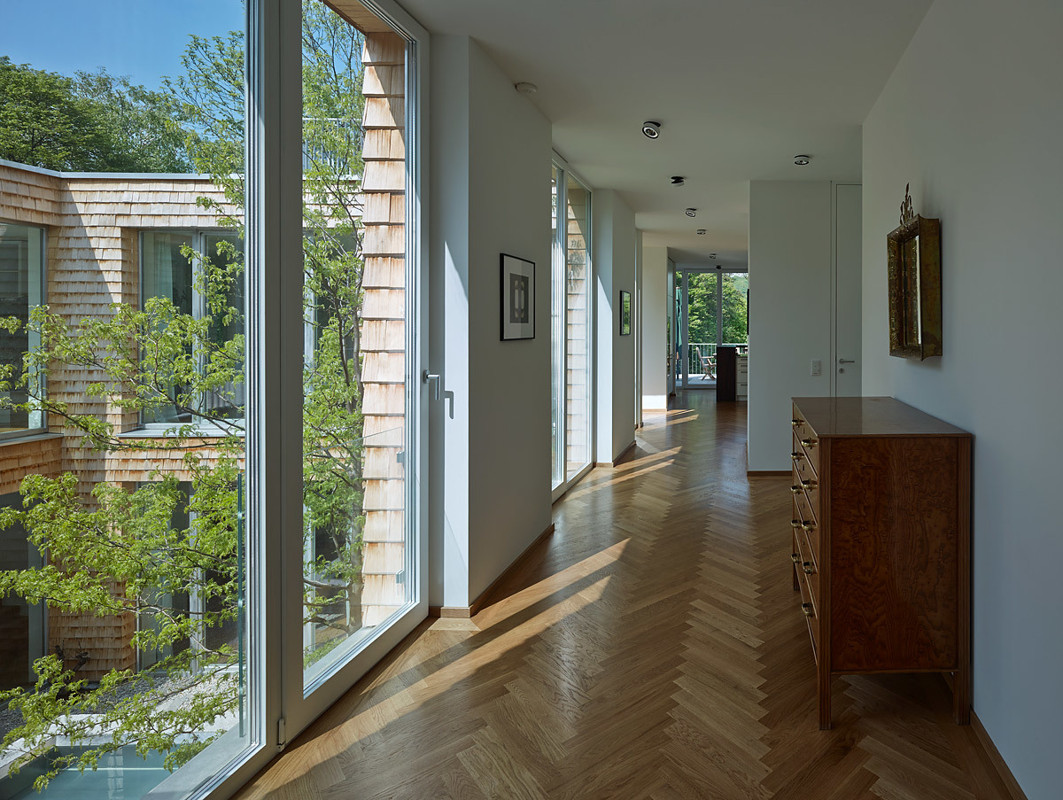 Raumhohe Verglasungen geben den Blick auf das 3,7 m tiefer liegende Atrium frei. Das Atrium ermöglicht, dass Sonnenstrahlen trotz Nordhanglage direkt in die Schlaf,- Sanitär- und Aufenthaltsräume im Untergeschoss gelangen. Jene Räume mit geringem Belichtungsbedarf (Technik, Lager) sind im hinteren Gebäudeteil des Hanghauses untergebracht. Ein Raum im Untergeschoss fällt aus der Reihe: der Musikraum wurde mit einem Niveausprung in den Hang eingebettet. Die lichte Höhe aller Räume beträgt 3 m, lediglich der Musikraum ist auf Wunsch der Bauherren noch großzügiger dimensioniert. Die steile Hanglage gibt – trotz Lage im Untergeschoss – den Blick in die Baumkronen des nordseitig angrenzenden Gartens frei. Eine raumhohe Bücherwand und ein markanter Kamin komplettieren das „Herrenzimmer“.