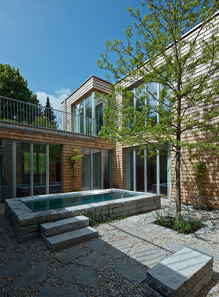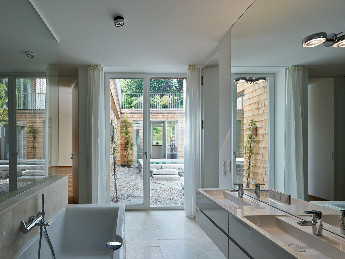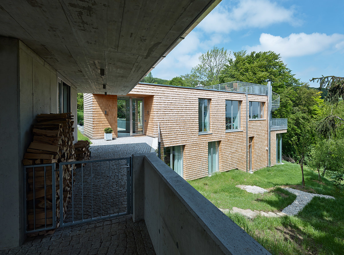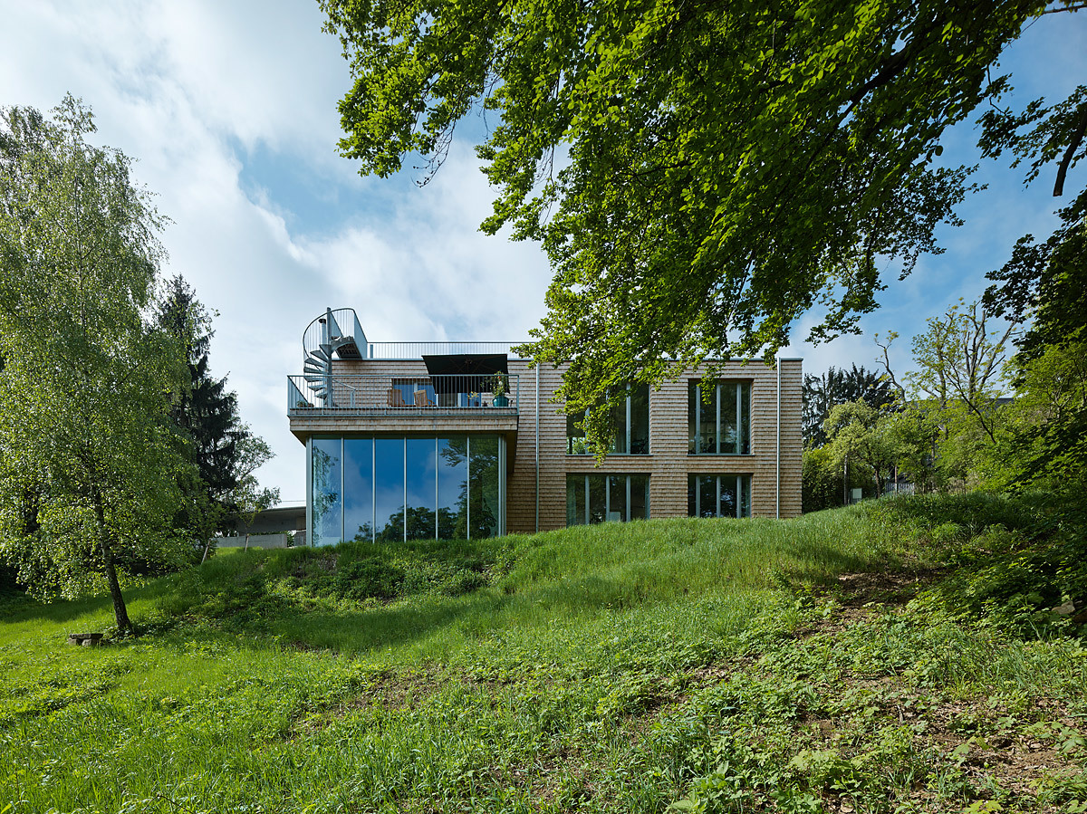 Raumhohe Verglasungen geben den Blick auf das 3,7 m tiefer liegende Atrium frei. Das Atrium ermöglicht, dass Sonnenstrahlen trotz Nordhanglage direkt in die Schlaf,- Sanitär- und Aufenthaltsräume im Untergeschoss gelangen. Jene Räume mit geringem Belichtungsbedarf (Technik, Lager) sind im hinteren Gebäudeteil des Hanghauses untergebracht. Ein Raum im Untergeschoss fällt aus der Reihe: der Musikraum wurde mit einem Niveausprung in den Hang eingebettet. Die lichte Höhe aller Räume beträgt 3 m, lediglich der Musikraum ist auf Wunsch der Bauherren noch großzügiger dimensioniert. Die steile Hanglage gibt – trotz Lage im Untergeschoss – den Blick in die Baumkronen des nordseitig angrenzenden Gartens frei. Eine raumhohe Bücherwand und ein markanter Kamin komplettieren das „Herrenzimmer“.