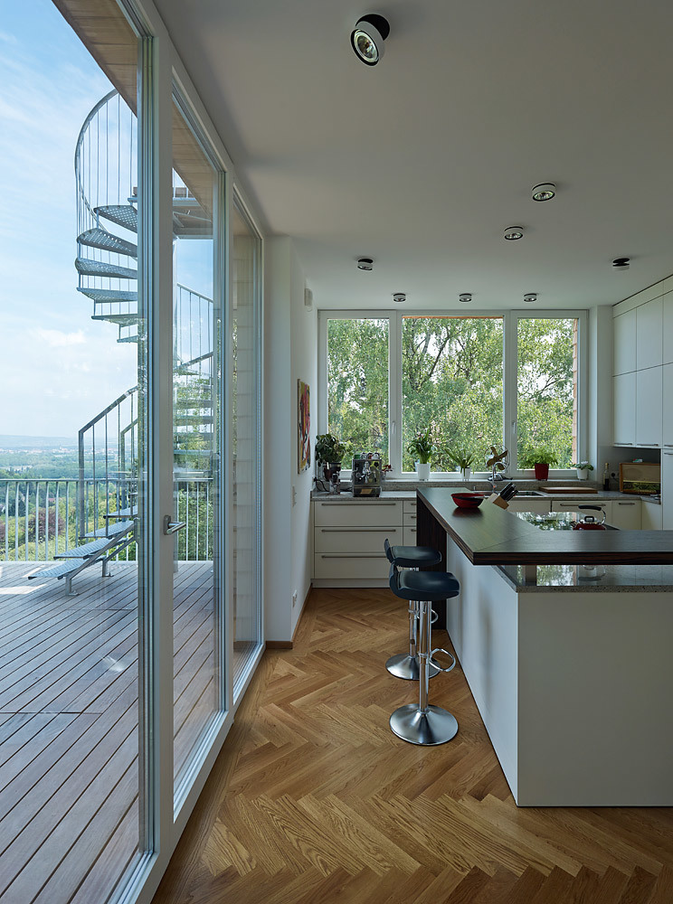 Aus der Hanglange resultieren zwei Geschosse: das Obergeschoss liegt auf Straßennivau. Hier befinden sich der Eingangsbereich, die Küche sowie der Wohn- und Essbereich mit vorgelagerter Terrasse. Eine gewendelte Außentreppe führt hinauf auf die Dachterrasse, welche einen atemberaubenden Rundumblick über die Donaulandschaft und den Wienerwald bietet.
