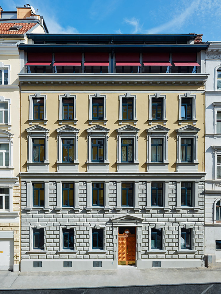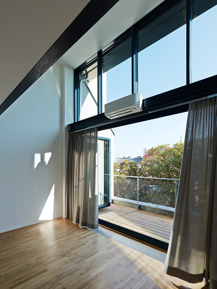 So attraktiv der Ausblick und die exklusive Lage auch sind: Überhitzung stellt ein Problem in Dachwohnungen dar. In der Regel wird das Problem wenig innovativ und auch nicht nachhaltig mithilfe von Klimageräten gelöst. Der Architekt stemmt sich gegen den Einbau von Klimageräten im Wohnbereich, indem er auf eine natürliche Querdurchlüftung setzt. Die innenliegenden Wände der Schlafräume im zweiten Dachgeschoss wurden mit schmalen Fensterbändern ausgestattet, die sich über Kopfhöhe befinden und insbesondere in den Nachtstunden eine gute Querdurchlüftung ermöglichen. Die erhöhte Lage des Wohnhauses – die Diehlgasse steigt nach Süden hin an – bietet zudem eine gute Voraussetzung für eine nachhaltige Temperaturregelung. (Text: Martina Frühwirth)