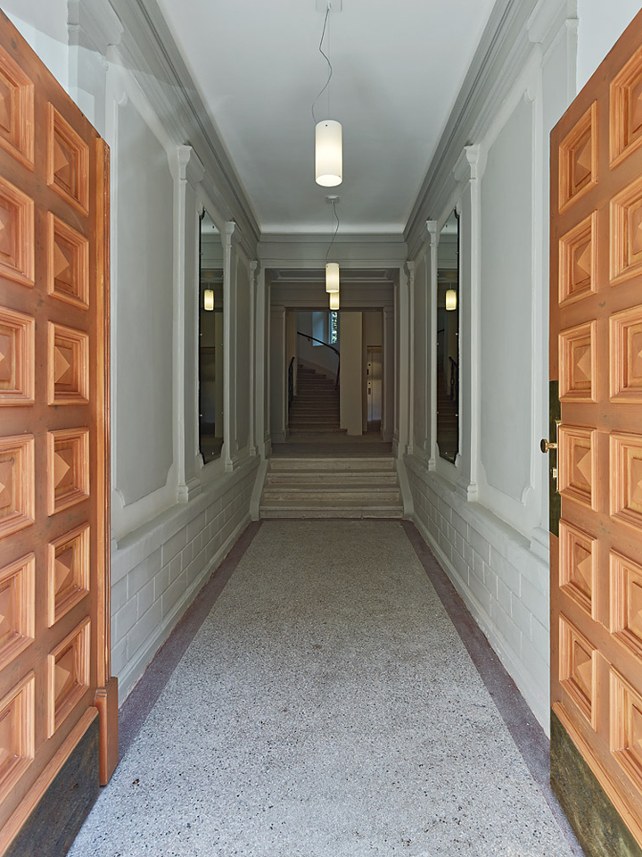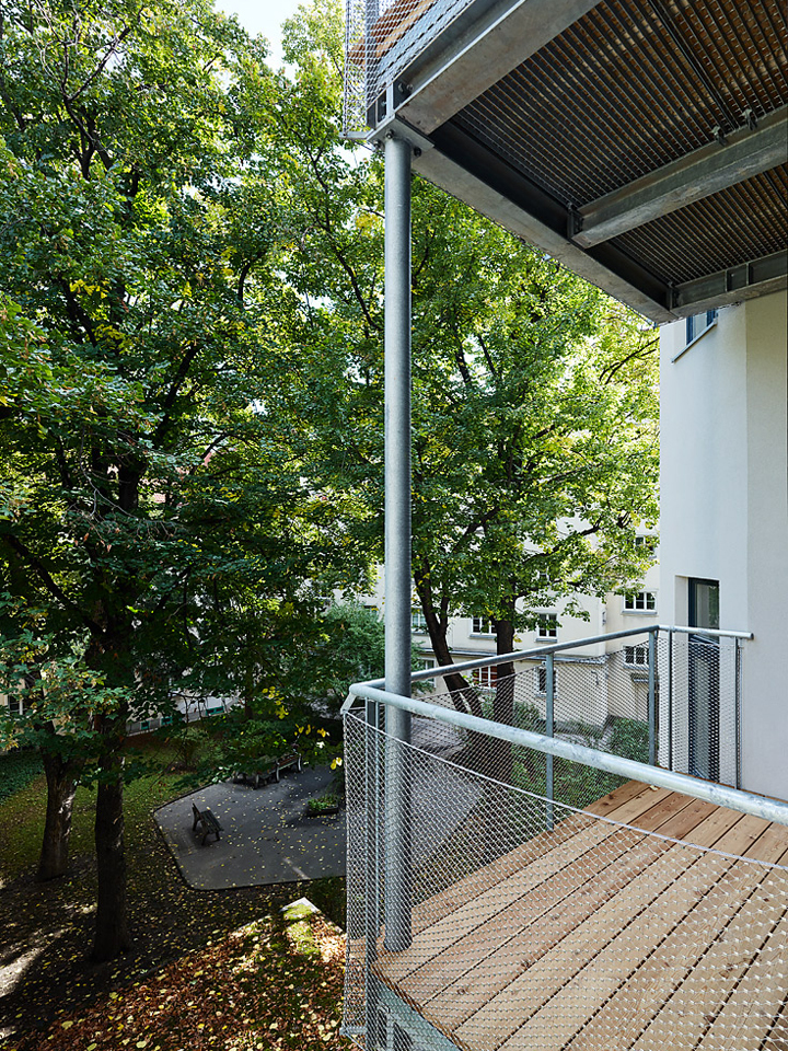Die Ausgangslage der beiden hofseitigen Erdgeschosswohnungen war zum Zeitpunkt der Sanierung in jeder Hinsicht benachteiligt: ohne Ausblick, relativ schlecht belichtet und ohne wohnungsbezogenen Freiraum ausgestattet, konnten die beiden Wohnungen maßgeblich aufgewertet werden, indem sie um private Terrassen erweitert wurden. Gemauerte Einfassungen bieten hier ein Mindestmaß an Privatsphäre.