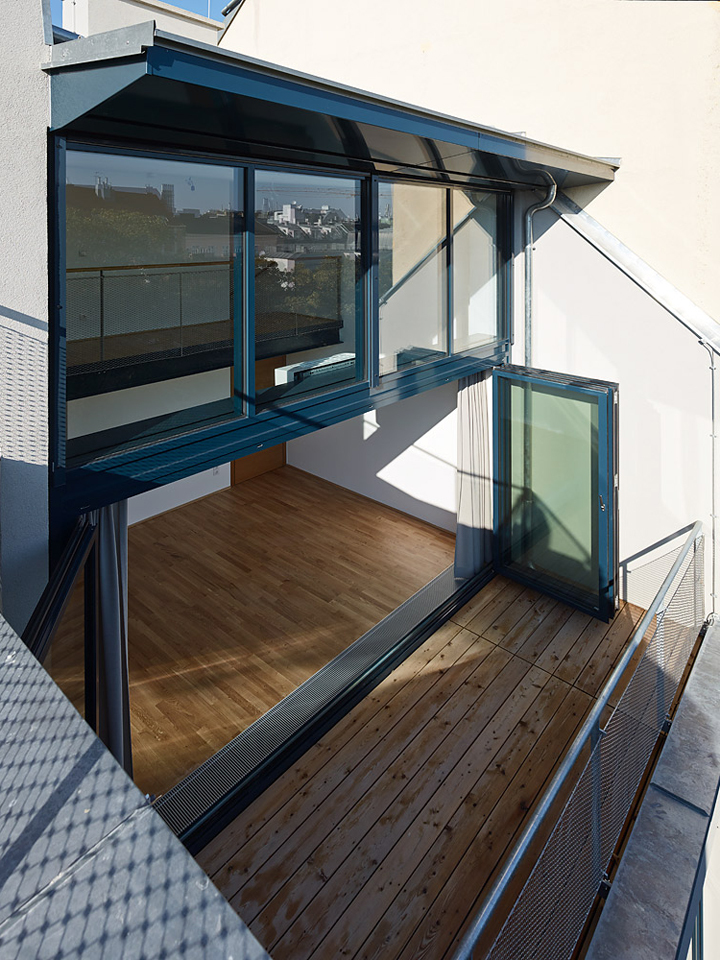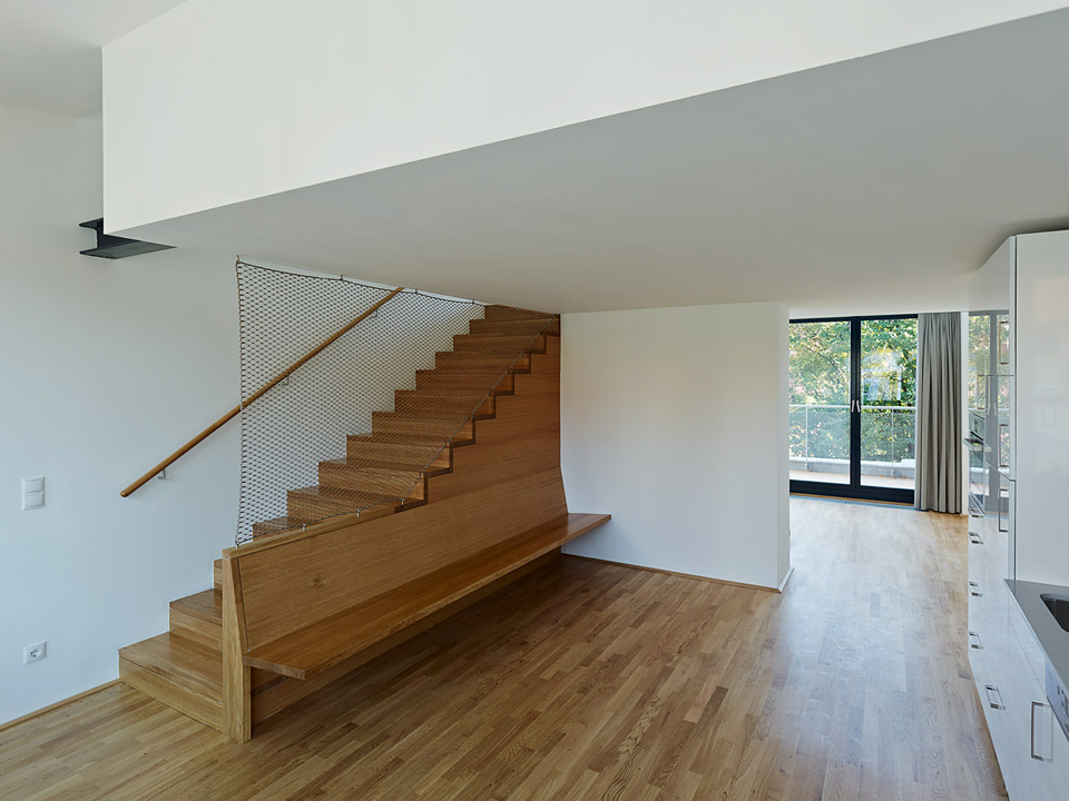 Die Dachgeschosswohnungen sind als Maisonette-Wohnungen ausgeführt. Im ersten Dachgeschoss befindet sich der Eingang und der offene Wohnbereich mit straßenseitig orientierter Küche. Eine Holztreppe führt hinauf zu den Schlafräumen im zweiten Dachgeschoss. Die Holztreppe ist eine Tischlerarbeit und nützt den Raum perfekt aus. Der Bereich unter der Treppe dient als Stauraum. Entlang des Treppensockels erstreckt sich eine ungewöhnlich lange Küchenbank, die, wie auch die Treppe, aus Vollholz ist. Hofseitig öffnet sich der Wohnraum mit einem Balkon zum begrünten Innenhof hin. Ein ausgeklügeltes Türsystem erlaubt, dass die Balkontüren komplett zur Seite geschoben werden können. Der Wohnraum erstreckt sich auf den Balkon hinaus, niveaugleich, ohne Stolperfalle. Raumhohe Fenster und die doppelte Raumhöhe mit offener Galerie im 2. Dachgeschoss verstärken den offenen Raumeindruck. Vor zu viel Sonneneinstrahlung schützen wiederum Markisen und Vorhänge, farblich abgestimmt auf die graublauen Fenster- und Türrahmen.