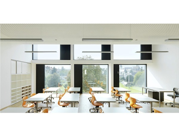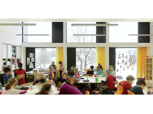 Die Unterscheidung der bei den Nischen vorgesetzten und darüber zurückspringenden Fensterebenen gibt den hohen Klassenräumen die Maßstäblichkeit kleiner Kinder zurück und ermöglicht auch für sie den freien Ausblick in die Umgebung, ohne Einschränkung durch hohe Fensterbrüstungen, wie im Altbau. (Text: Architekt:innen)