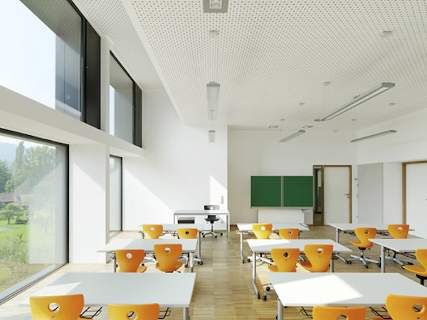 Die ungewöhnliche Raumhöhe von rund vier Metern, ermöglicht eine differenzierte Gestaltung der neuen Fassade, die sich über ihre gesamte Höhe, also von Fußboden bis Decke, dem Ausblick über den Schulhof und die angrenzenden großen Grünflächen, bis zum Plabutsch hin öffnet. In etwa zwei Metern Höhe springt die Fensterebene um 80 cm Tiefe zurück in den Raum. Zwischen den Außenwänden und den beiden Wandstützen entstehen drei Fensternischen mit einer Raumhöhe von zwei Metern und einem Fenster, das bis zum Fußboden reicht. Das über diesen Nischen liegende Fensterband wird auf deren Innenkante zurückversetzt und bringt damit anderes Licht in den Raum.