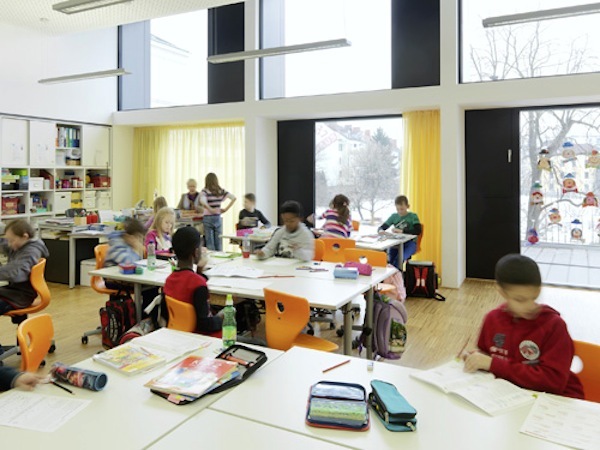 Vom Nutzungskonzept neu interpretiert wird der neue, überbreite Erschließungsbereich an der Straßenseite, der sich durch die Stellung der tragenden Mittelwand im Gebäude ergibt. Unmittelbar den Klassenräumen zugeordnet und durch breite Wanddurchbrüche mit ihnen verbunden, bieten diese Bereiche neue Nutzungsmöglichkeiten, über die einfache Gang- und Garderobenfläche hinaus. Im Zusammenspiel mit der neuen Bodenoberfläche aus Holz und darunter liegenden Fußbodenheizung, können diese Räume als Erweiterung der Klassen, für Gruppenarbeiten und als Spiel- oder Pausenräume genutzt werden, ganz den neuen pädagogischen Konzepten folgend. Bleiben die breiten Doppeltüren in der Mittelwand geschlossen, arbeitet die Klasse konzentriert in ihrem Raum, oder aber sie orientiert sich zum Gruppenraum, der ebenfalls an der Hofseite des Gebäudes liegt.