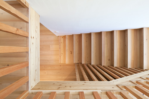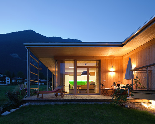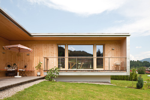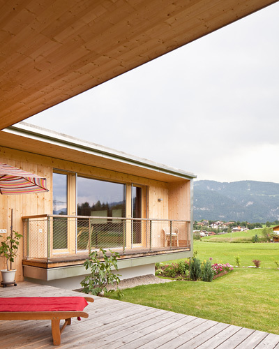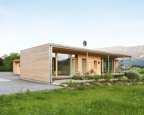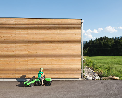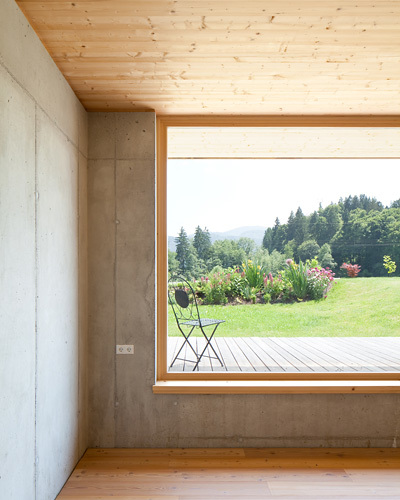 Einer der Kuben „gehört“ den Eltern, der andere den Kindern, an der Schnittstelle liegen die Küche und der Wohnbereich als gemeinsamer Treffpunkt – fein ausdifferenzierte Bereiche mit unterschiedlichen Raumhöhen. An den Längsseiten öffnet sich das Haus über große Fensterflächen in die Landschaft, weit vorspringende Vordächer bieten entsprechenden Witterungsschutz.