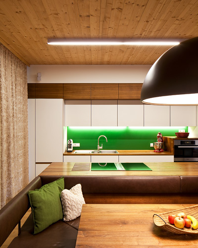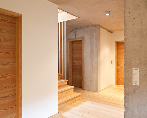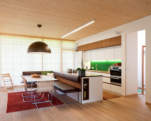 Der gesamte Innenausbau bis hin zum Küchenblock mit Arbeitsflächen aus geöltem Walnussholz stammt vom Bauherren selbst. Ökologisches Bauen war ihm sehr wichtig – das Niedrigstenergiestandard erfüllende Haus wurde mit Fernwärmeanschluss und einer kontrollierten Wohnraumbelüftung ausgestattet, die Dachflächen wurden begrünt. (Text: Architekt; red. bearbeitet)
