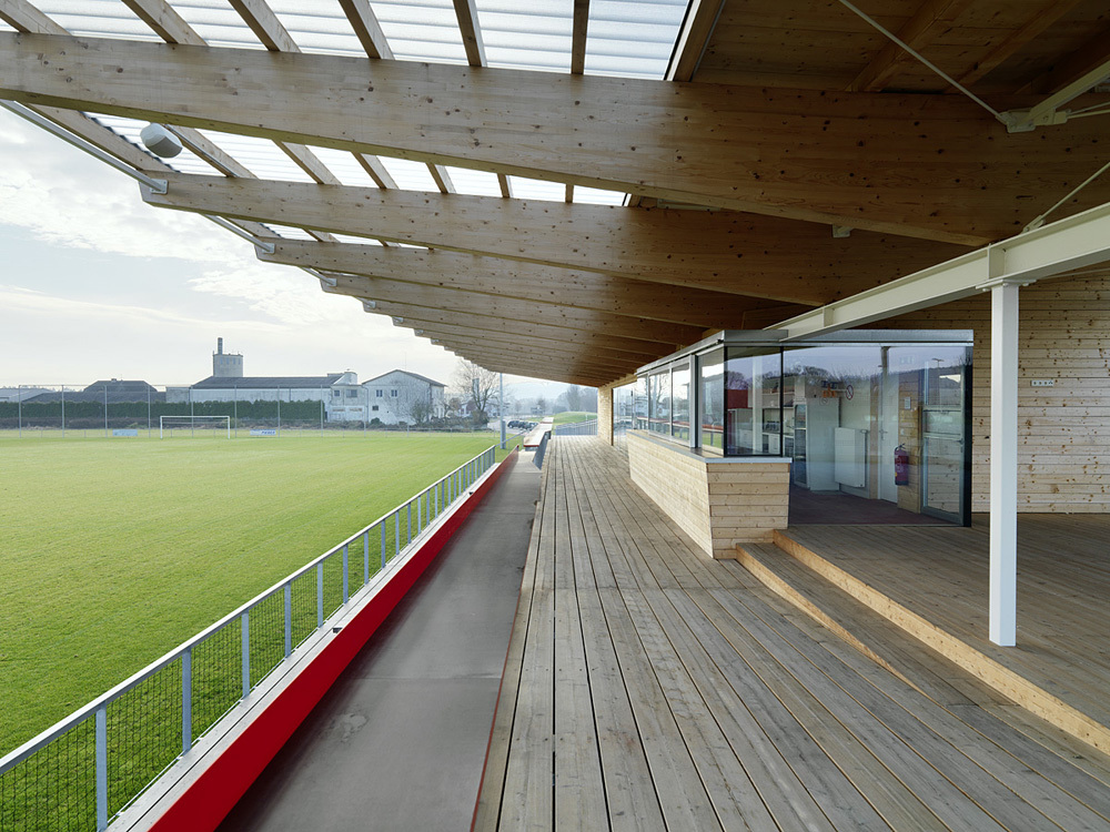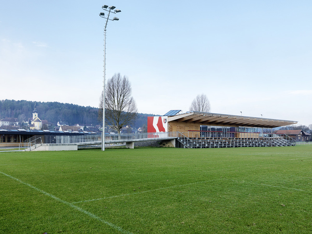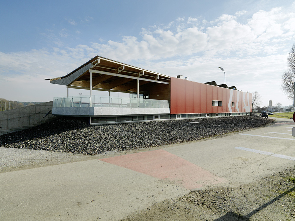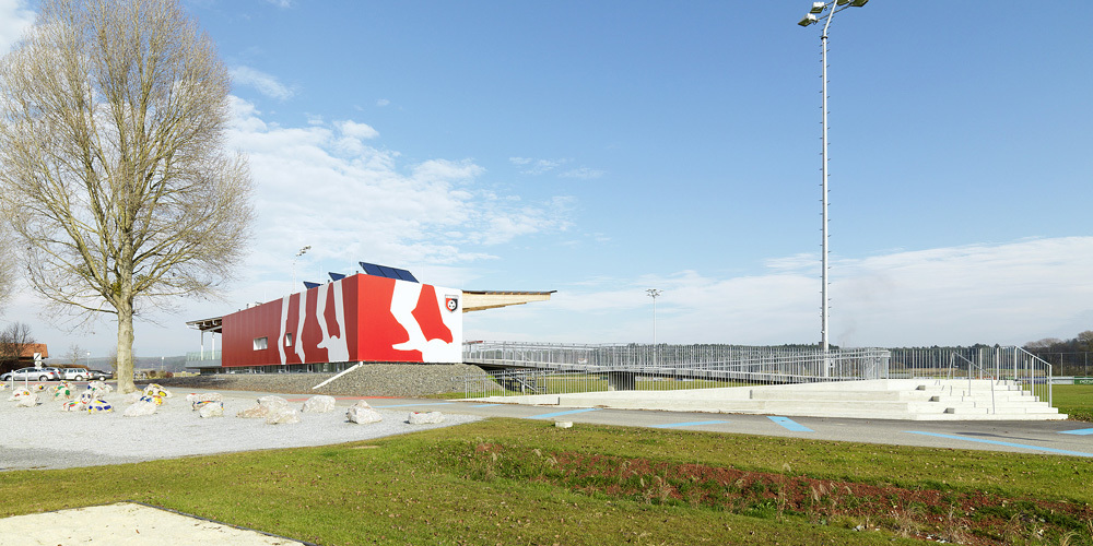 Das Sportgebäude sendet mit seiner roten folienbespannten Süd- und Westfassade ein starkes Signal Richtung Dorf und die umliegenden Hügel. Die schlicht gehaltene Zuschauertribüne öffnet sich nach Nordosten zu den Fußballplätzen hin und Richtung Umgehungsstraße.