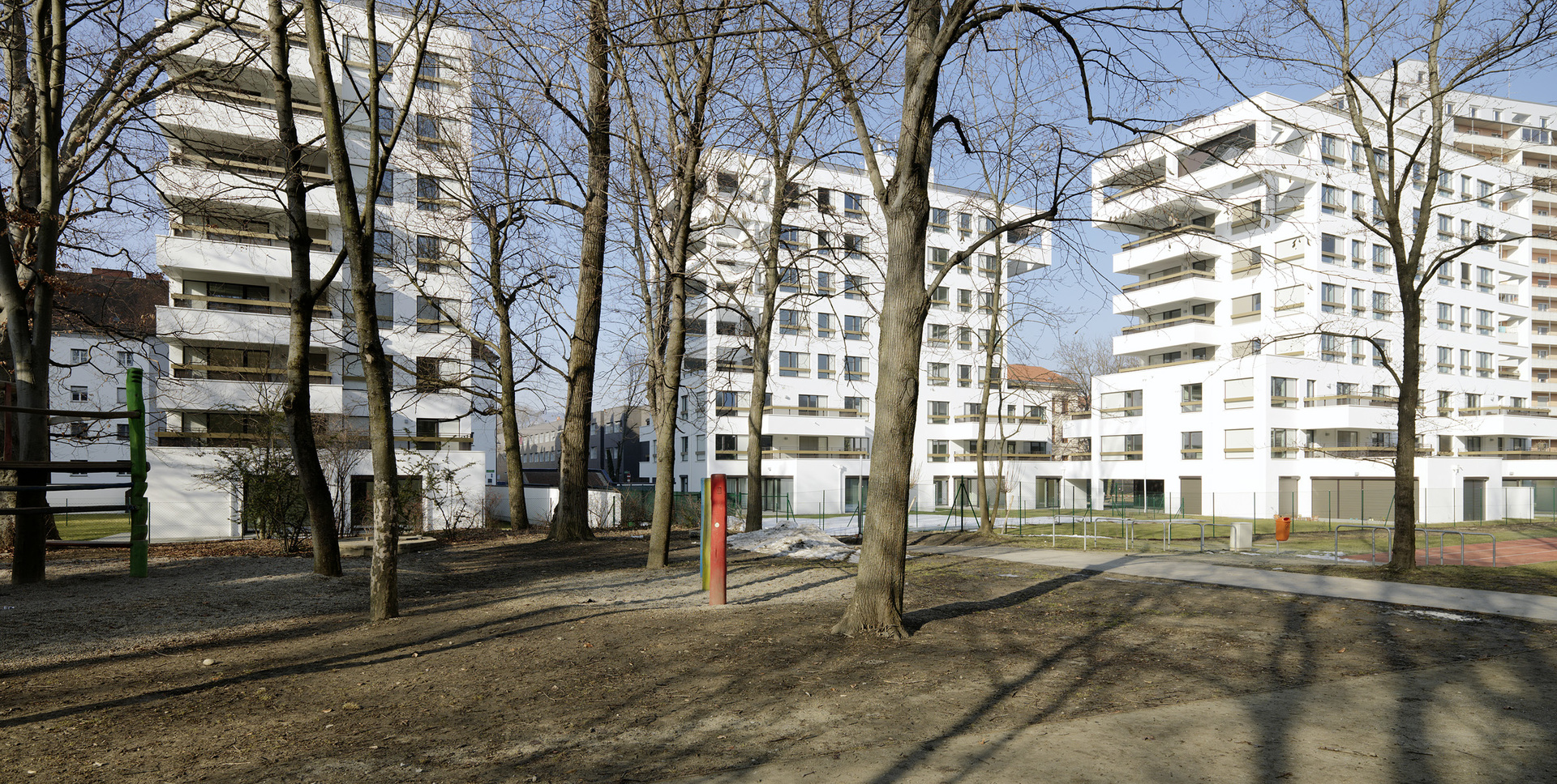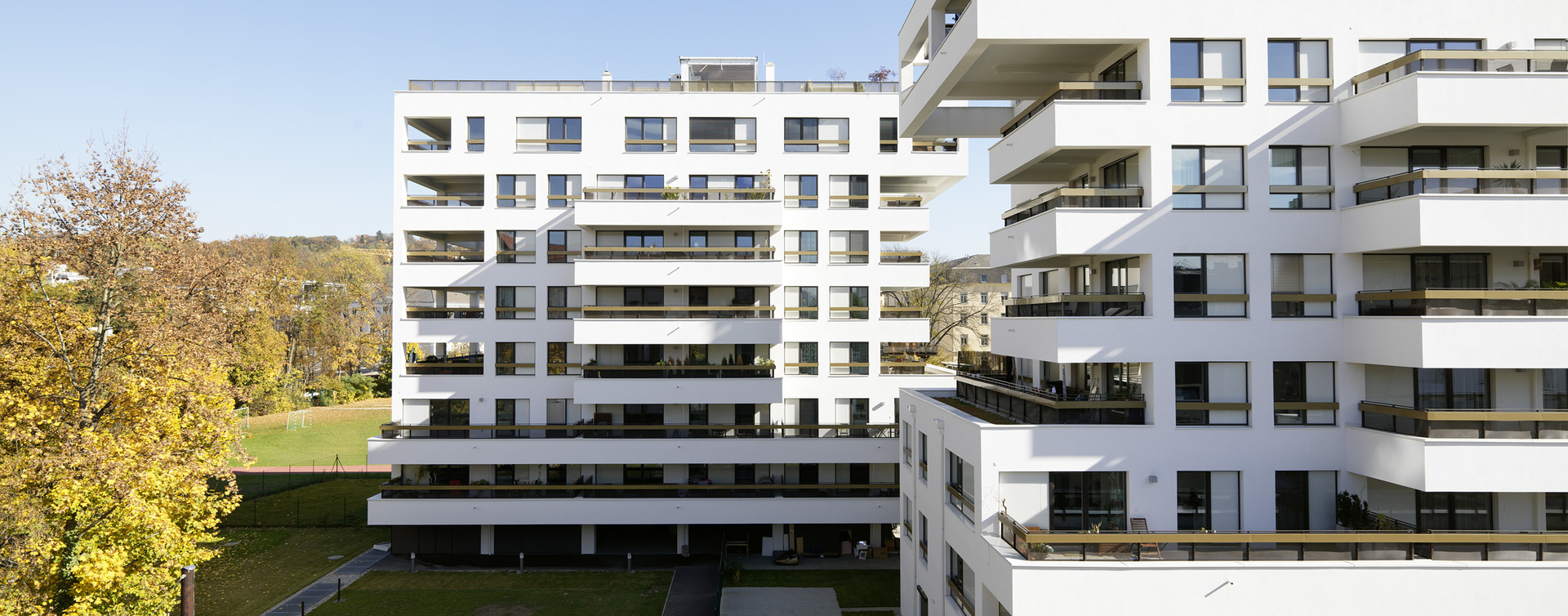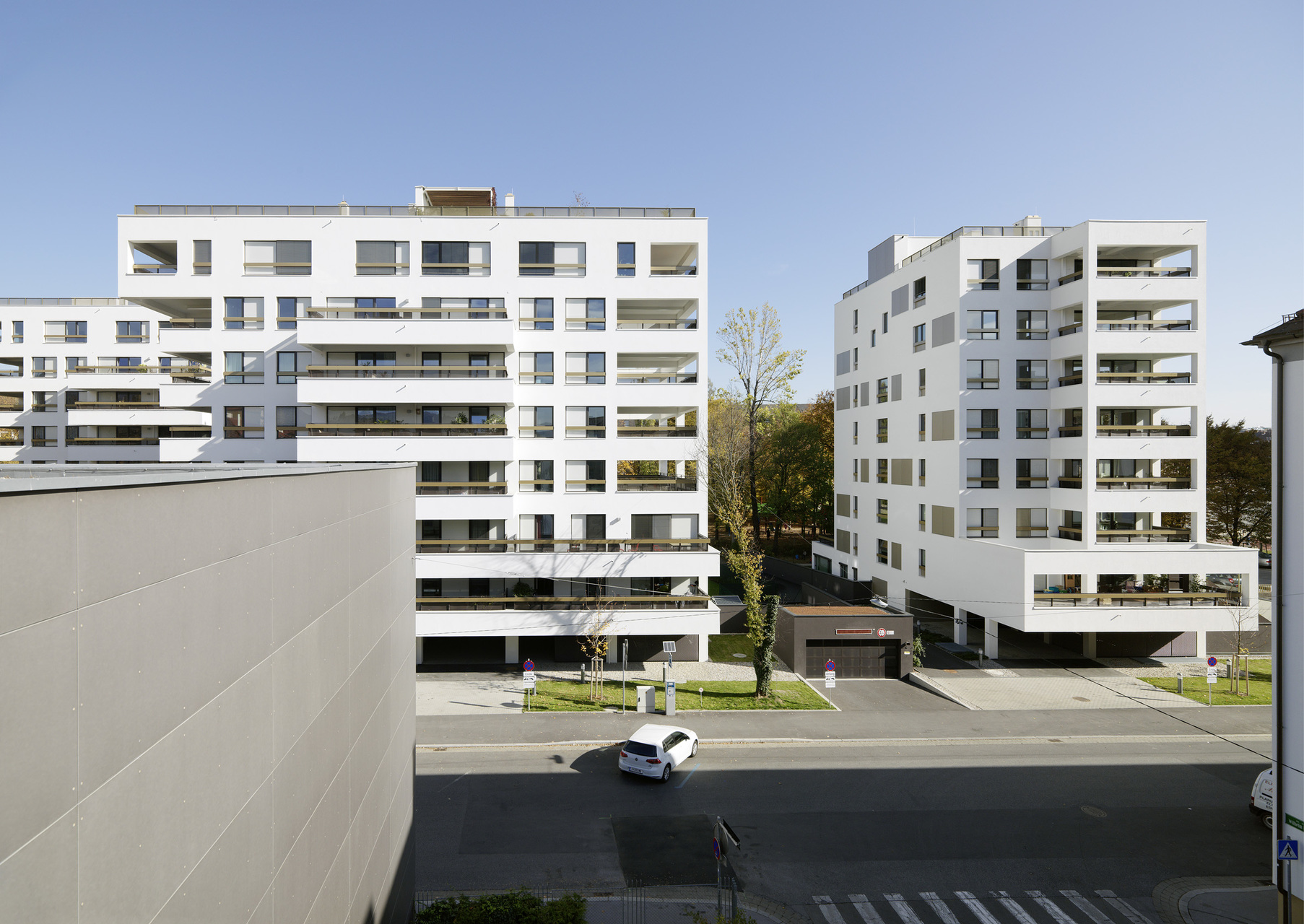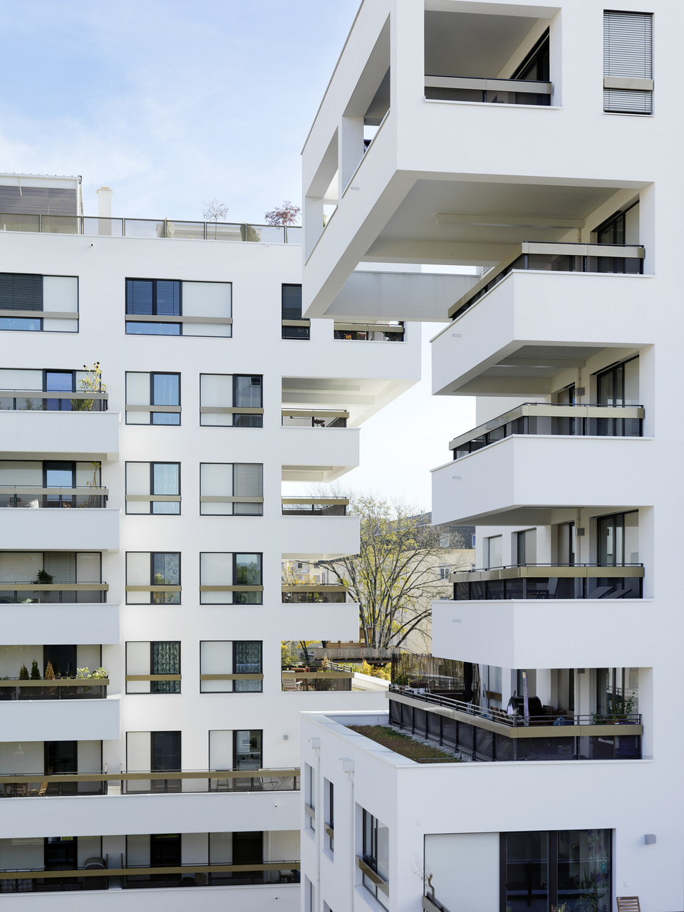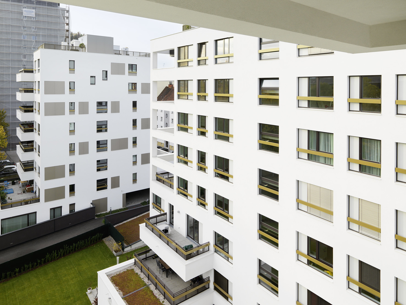 Die Anlage verfügt über 65 freifinanzierte Wohneinheiten. Die Vielfalt der Wohnungstypen soll unterschiedliche Bevölkerungsgruppen ansprechen und eine gewisse soziale Durchmischung generieren: Familienwohnungen mit 120-140 m² und Gartenanteil, 70 m² Wohnungen, zweigeschossige Wohnungen (Maisonetten). Die angebotene Vielfalt der Wohnungstypen ist am Fassadenbild nicht ablesbar. Nach außen präsentiert sich die Wohnanlage sehr reduziert, ja nahezu minimalistisch. Vorherrschendes Gestaltungselement sind die lackierten Aluminiumbänder. Sie gliedern die großzügig dimensionierten Fensterflügel und dienen auch als Balkonbrüstung. Die horizontal verlaufenden Fensterteilungen befinden sich durchgehend auf exakt derselben Höhe wie die Balkonbrüstungen und erzeugen so eine prägnante horizontale Gliederung. Die weit auskragenden Balkone wiederum vermitteln in ihrer vertikalen Staffelung starke vertikale Akzente.