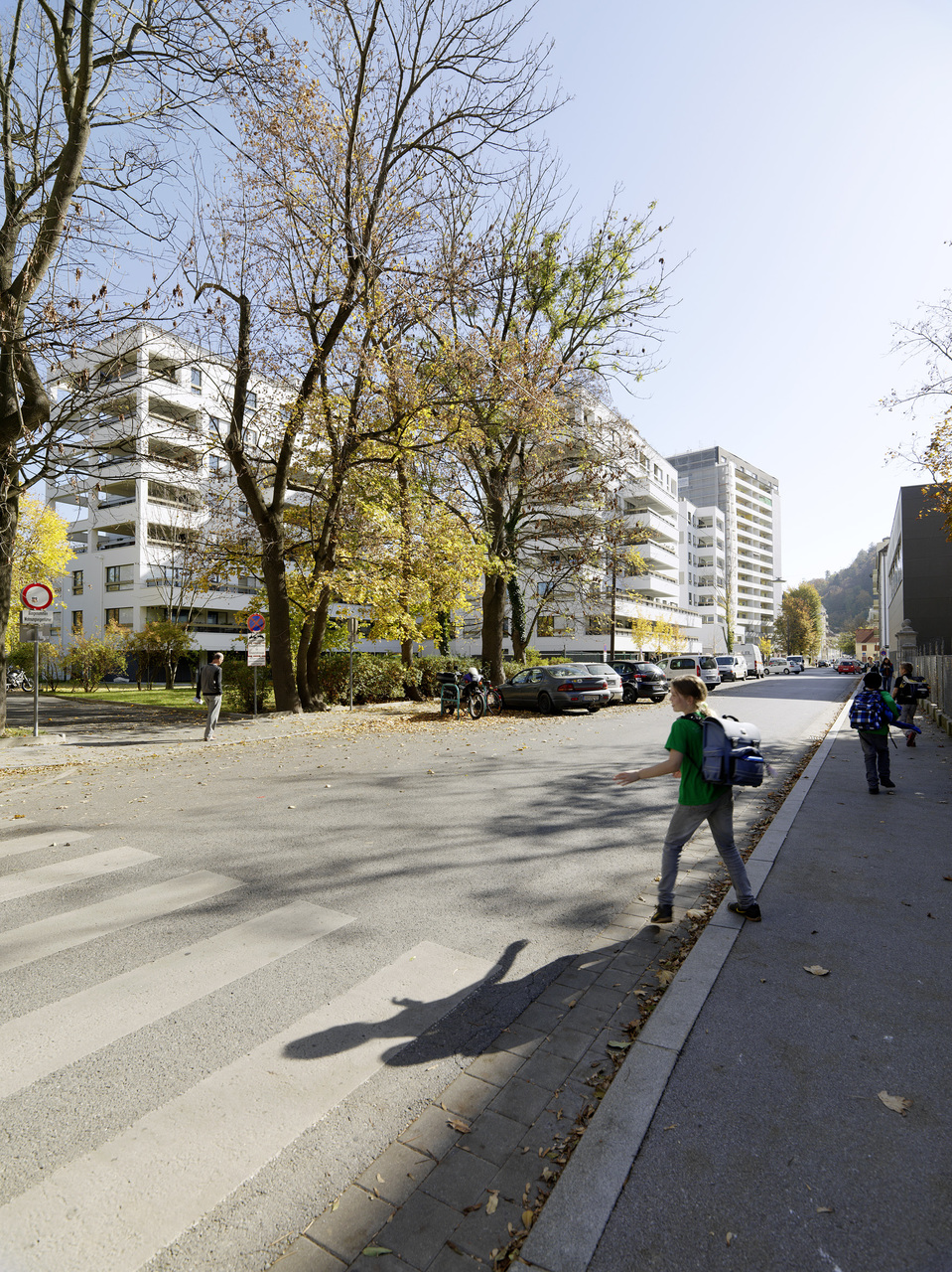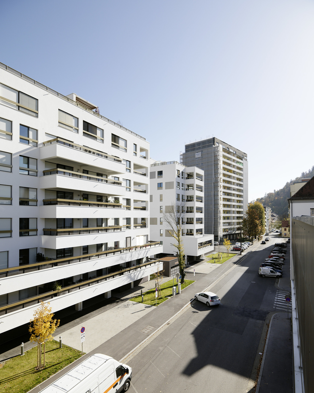 Drei freistehende, achtgeschossige Baukörper, zwei davon in der Erdgeschosszone verbunden, erfüllen die notwendigen baulichen Abstände zur Nachbarschaft und schaffen die gewünschte urbane Dichte an diesem zentral gelegenen Standort. Zwischen den Gebäuden und in Richtung des Parks der Pädagogischen Hochschule öffnet sich ein großzügiger Grünraum mit privaten Gärten. Die Platzierung der Baukörper gibt den Blick auf die umliegende Hügellandschaft frei. Alle drei Häuser werden von einem großzügigen befestigten Vorbereich erschlossen, der die öffentliche Zone entlang der Laimburggasse zu den Gebäuden hin erweitert.