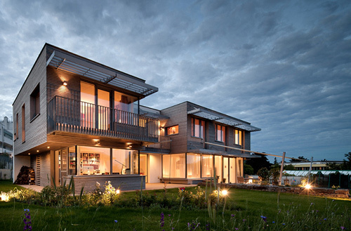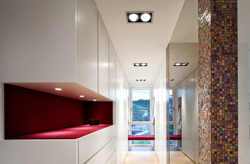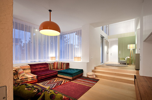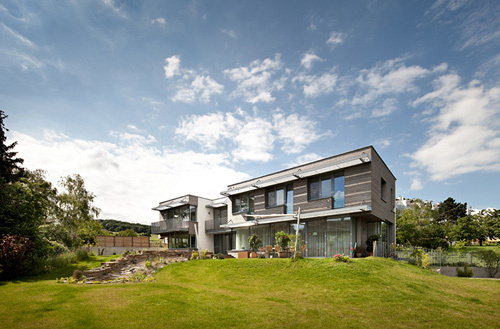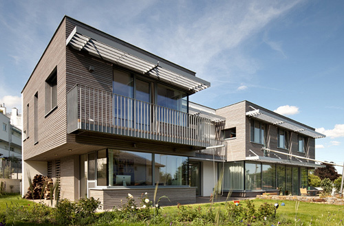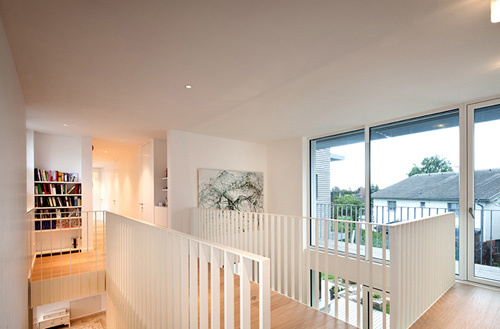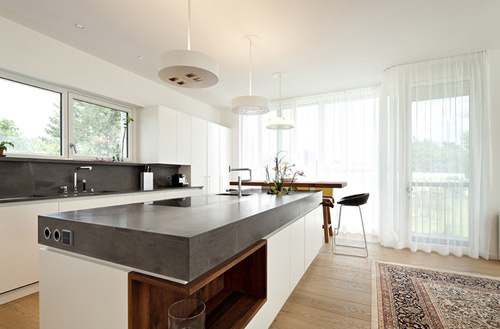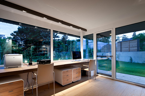 Das Erdgeschoss besteht in erster Linie aus einem großen Raum mit Zonen fürs Kochen, Essen und Wohnen. Der Wohnraum steht mit großflächigen Verglasungen in enger Verbindung zu den Terrassen- und Gartenflächen. Hier erzeugt der Holzboden (gehobelte Eiche) ein willkommenes atmosphärisches Gegengewicht zum kühlen Glas der gartenseitigen Außenwand. Ebenfalls im Erdgeschoss befindet sich das Büro. Großflächige Fenster geben den Ausblick auf den Garten frei. Der weitläufige Garten hätte auch Platz für einen Swimmingpool geboten, die Bauherren haben sich jedoch (vorläufig) gegen einen Pool und für maximale Freiheitsgrade für die spielenden Kleinkinder ausgesprochen. Anstelle dessen wurde ein naturnaher, kindgerechter Wasserlauf angelegt. Das Wasser plätschert entlang der Geländemodellierung in ein seichtes Bassin, wo sich Wassertiere tummeln und die Neugierde der Kinder wecken. (Martina Frühwirth nach einem Text des Architekten)