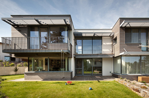 Wunsch der Bauherren war ein Haus für die fünfköpfige Familie, in dem der Garten und die Jahreszeiten integriert werden. Daher wurde das Gebäude nicht parallel zur Grundstücksgrenze, sondern nach der Sonne ausgerichtet positioniert: Morgensonne in der Küche und einigen Schlafräumen, Sonne den ganzen Tag über in den Haupträumen und Abendsonne in ausgewählten Bereichen. Auch die im Keller befindlichen Aufenthaltsräume sollten Tageslicht bekommen, daher wurde die Höhenlage so gewählt, dass durch die Geländemodellierung an der Ostseite ein Lichthof entstand. Im Obergeschoss befinden sich die Rückzugsorte wie Schlaf- und Badezimmer. Hier eröffnen sich über den Lichthof hinweg Blickbeziehungen von den Kinderzimmern zum Elternschlafzimmer. Die Drehung des Hauses wirkt sich auch positiv auf die Blickbezüge in die Umgebung aus, indem der Blick – am Nachbarhaus vorbei – in die benachbarten Weingärten freigelegt wird.Die Anbindung des Hauses an den Außenraum war der Bauherrin ein wichtiges Anliegen. Lärchengedeckte Terrassen – mal breiter, mal schmäler ausgeführt – umrunden das Haus. Treppen führen von der Küche und vom Kellergeschoss in den Garten. Vom nordseitigen Vorplatz aus gelangt man links am Haus vorbei in den Garten und rechts vorbei zum Wirtschaftsraum. Dieser hat sich für die Familie als „Gatschraum“ etabliert. Hier ist Endstation für den Lehm, der aus den Weingärten bis ins Haus getragen wird. Die schmutzigen Heimkehrer werden in der Schleuse mit fließendem Wasser wieder hausfein gemacht. Die Tür zum Wirtschaftsraum ist mit Holzlatten verkleidet und fügt sich perfekt in das Fassadenbild der hinterlüfteten Holzfassade, die auf drei Seiten das Erscheinungsbild des Hauses prägt. Einzig die straßenseitige Nordwand wurde in verputzter Massivbauweise ausgeführt.