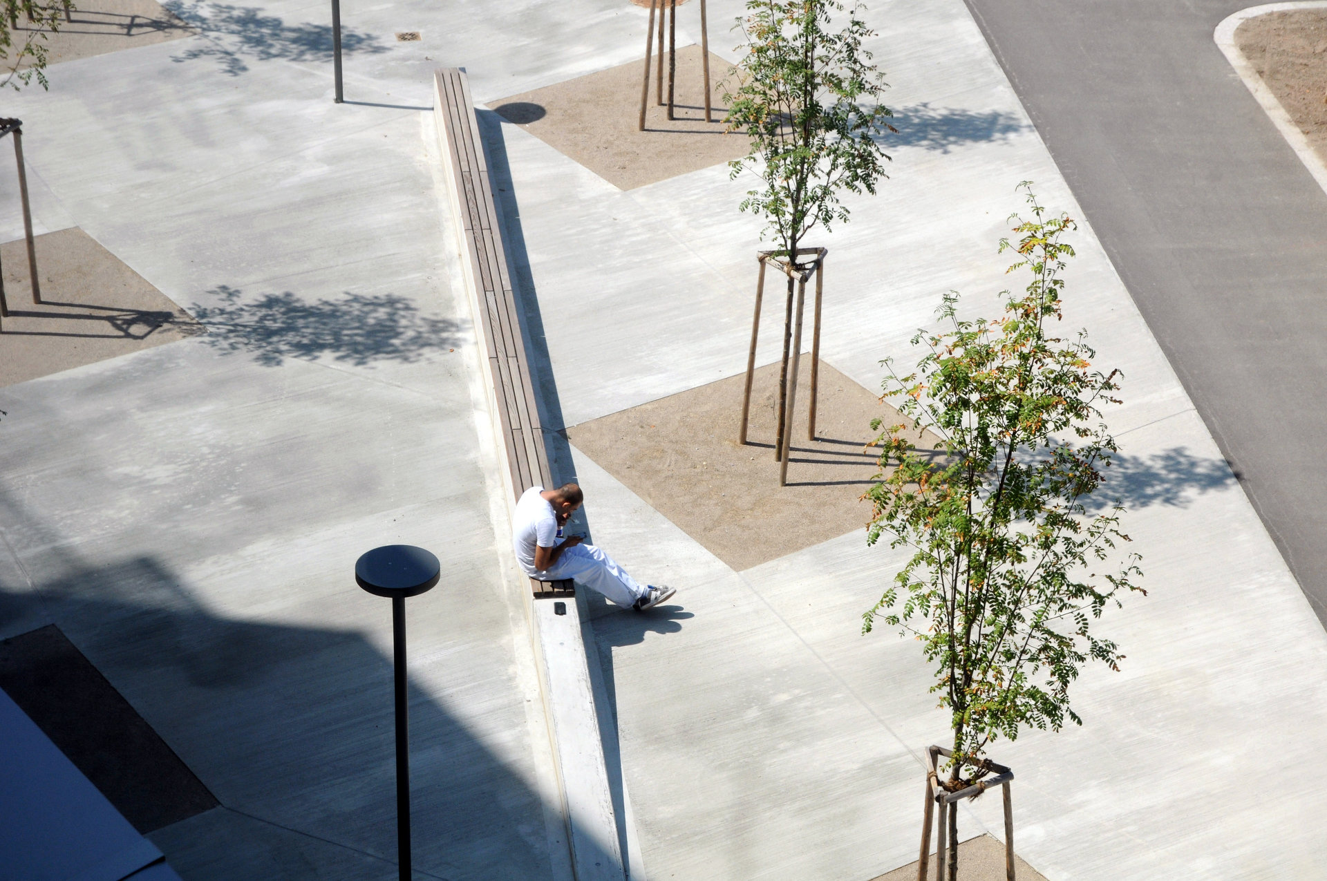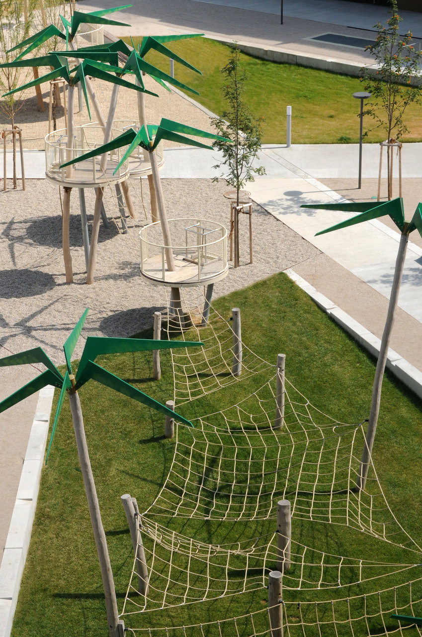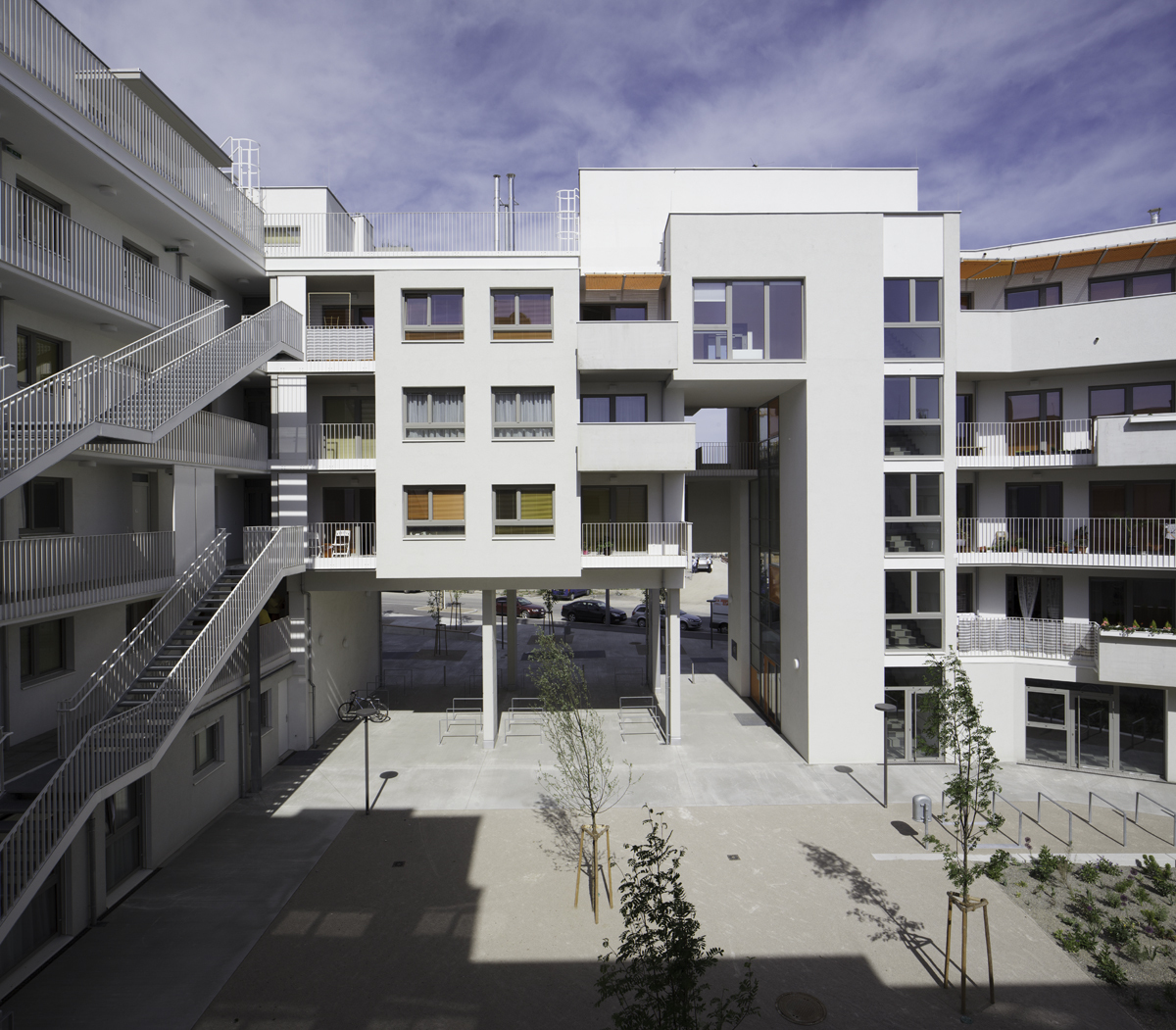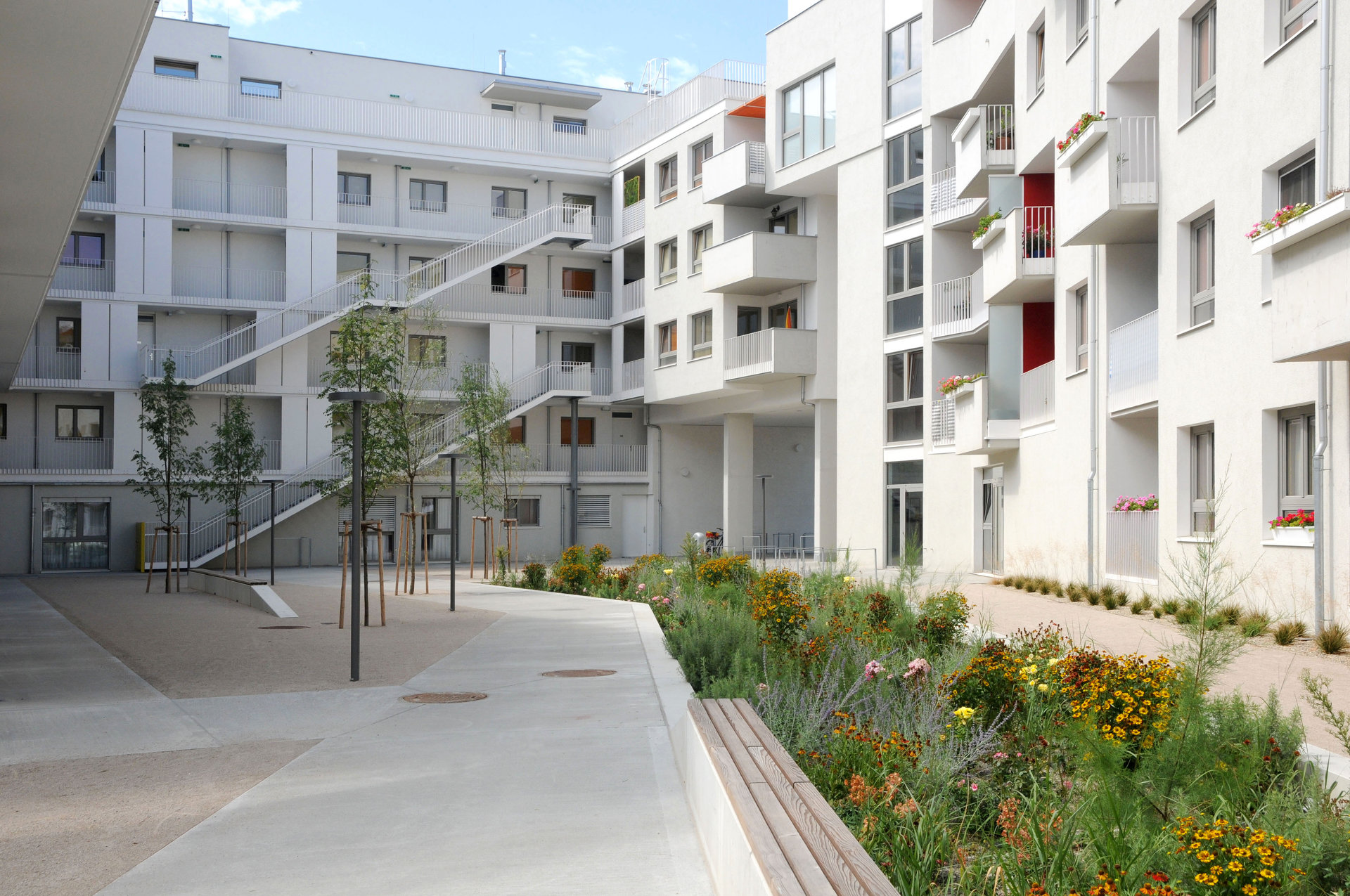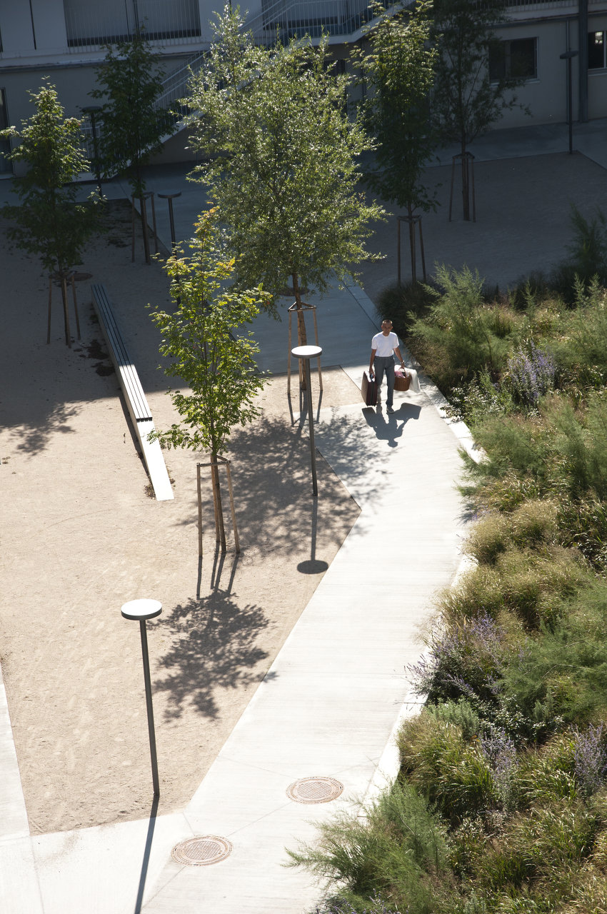 Von hoch oben am „Skywalk“ lässt sich die Gesamtheit des Innenhofs gut nachvollziehen. rajek barosch landschaftsarchitektur haben ein Freiraumkonzept entwickelt, das sich frei über Bauplatzgrenzen hinweg über den gesamten Innenhof bin in den hintersten Winkel erstreckt. Diese durchgehende Gestaltung verleiht dem Innenhof eine überraschende Großzügigkeit. Ebenfalls bemerkenswert ist die hohe Ausführungsqualität. Die Hauptachsen sind betonierte Felder, die über eine gezeichnete Besenstrich-Struktur verfügen. Weniger stark frequentierte Bereiche sind als wassergebundene Flächen ausgeführt. Wegbegleitende Mäuerchen werden dank Holzabdeckungen zu Bänken aufgewertet und laden zum „Bassena“-Plausch am Heimweg ein.