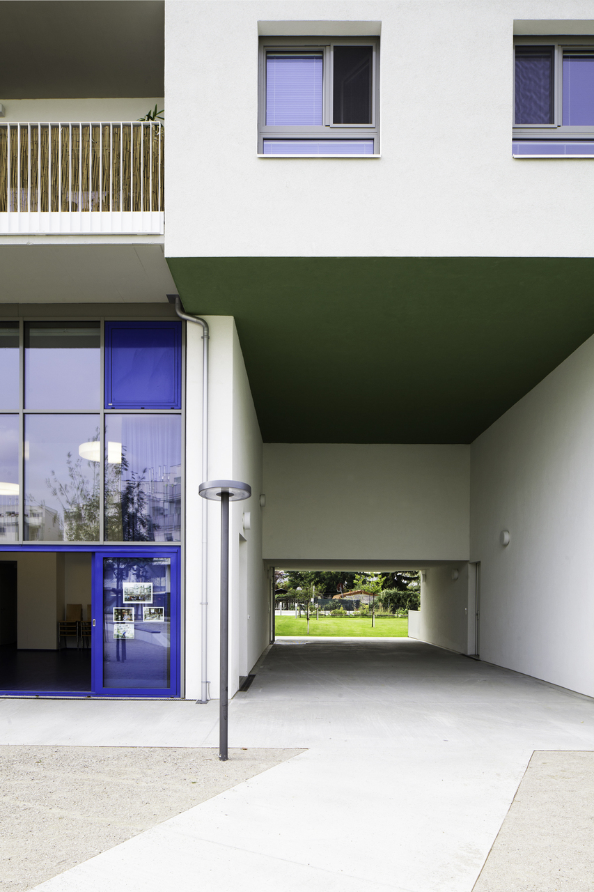 Die Bauteile von studio uek im westlichen Teil der OASE 22 mit der Bauklasse II und III umfassen 169 Wohneinheiten und ein geriatrisches Tageszentrum. Unterschiedliche Kombinationswohnungen können ge- oder entkoppelt werden (z.B. Wohnen mit Oma, Wohnen mit Youngster, Senioren-WG). Jede Wohneinheit verfügt über einen privaten Freibereich. In den beiden obersten Geschossen der „Fugen“ zwischen den Gebäuden befinden sich die Waschküchen sowie in Sichtverbindung dazu die Kinderspiel-/Gemeinschaftsräume. 30 Wohneinheiten sind als „betreubares Wohnen“ barrierefrei ausgestattet. Bewohner:innen leben hier weitgehend eigenständig und erhalten bei Bedarf Hilfestellungen. Beim Wohnungseingang weitet sich die Gangfläche zu Nischen, die Platz für Gehhilfen bieten. Zusätzlich verfügen diese Wohnungen alle über Einlagerungsräume (= als Kellerabteil) am Wohngeschoss.