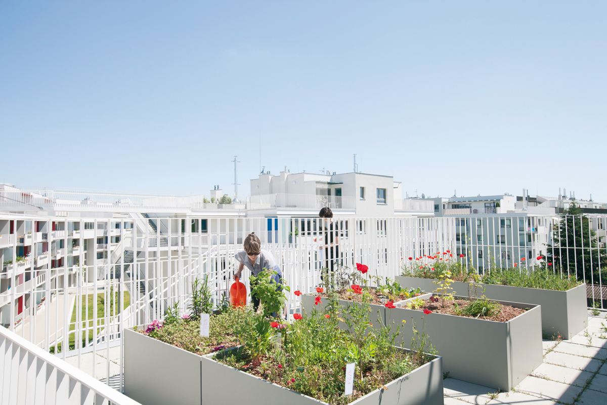 „Soziale Nachhaltigkeit“ bildet eine Säule für geförderten Wohnungsbau in Wien. Sie reicht in der OASE 22 weit über das Angebot von Gemeinschaftsräumen in der Erdgeschosszone, ein geriatrisches Tageszentrum, ein Hausbetreuungszentrum, den großen bauplatzübergreifenden Spiel- und Festraum sowie Fahrrad- und Kinderwagenabstellplätze hinaus. Oben auf dem Dach befindet sich eine zweite Ebene gemeinschaftlicher Nutzung: der „Skywalk“ ist ein umlaufender Freiraum, der für alle Bewohner:innen frei zugänglich ist. Brücken verbinden den Dachweg über alle Bauteile hinweg. Der „Skywalk“ bietet unterschiedliche Freiraumqualitäten: er führt von prominenten Aussichtspunkten vorbei an wenig einsehbaren Nischen und kleinen Plätzen weiter zu Plätzen mit Hochbeeten und Sitzgruppen, die zum Miteinander einladen. Die Diversität am Dach ist insbesondere für Jugendliche interessant. Die Nischen sind willkommene Rückzugsorte, wo die soziale Kontrolle der Nachbarschaft ausnahmsweise nicht greift.