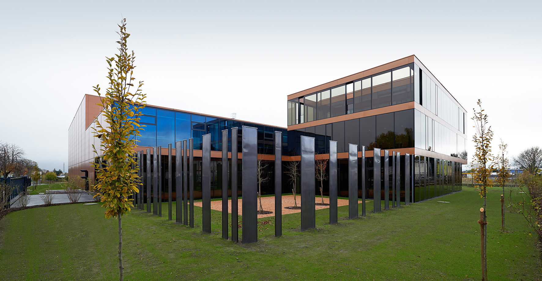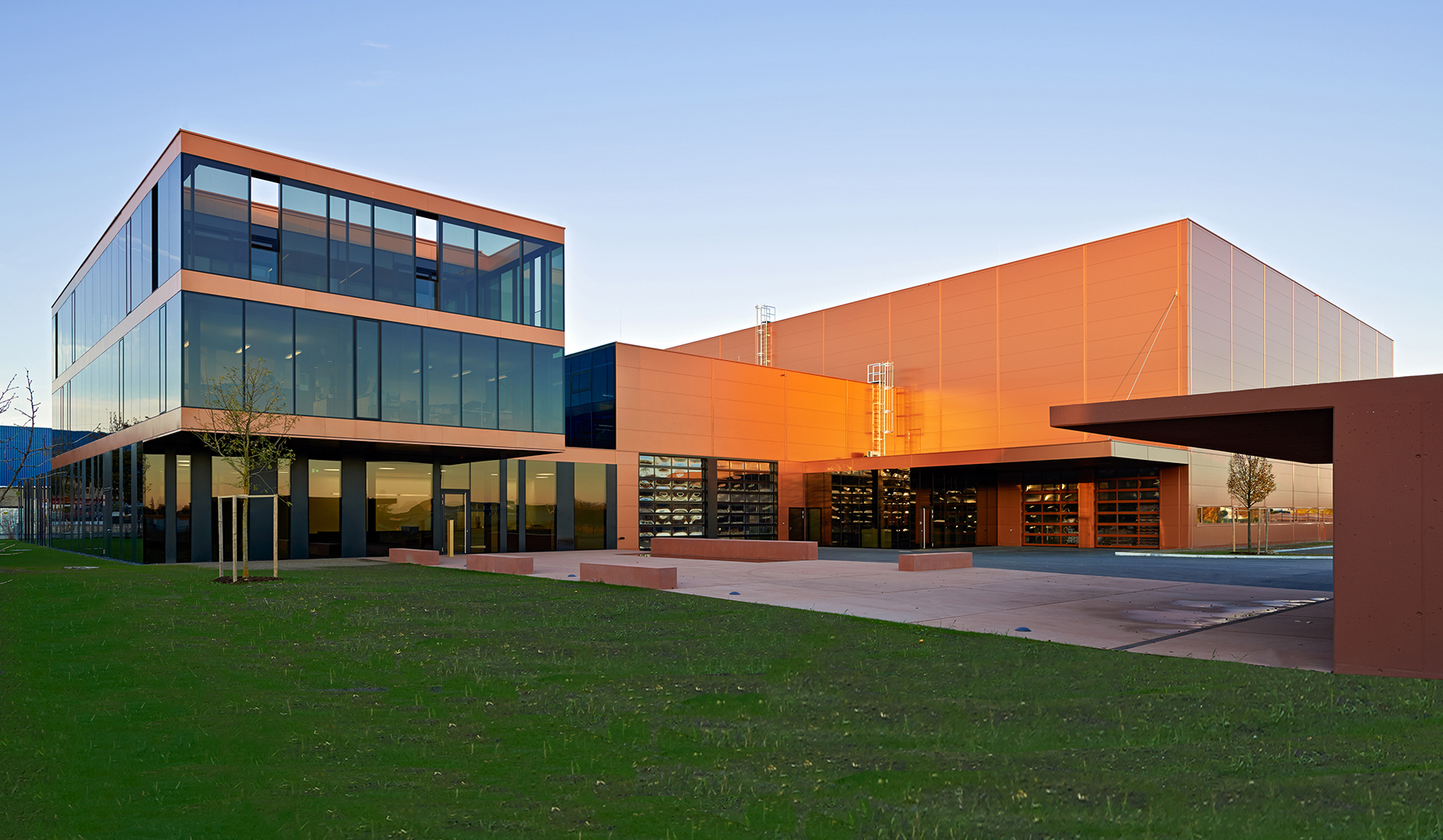 Optisch und funktionell teilt sich das Gebäude in das dreigeschossige Bürogebäude, den eingeschossigen Verbindungstrakt und die Lagerhalle. Diese wurde bereits als Vollausbau ausgeführt, die zur Verfügung stehende Fläche reicht über den aktuellen Bedarf hinaus: 2.500 m² werden aktuell genutzt, weitere 1.000 m² dienen als „Reservefläche“. Der Betrieb handelt vorwiegend mit Kupfer (Rohre, bis zu 7 m lang, „Langware“). Kupfer ist ein Material, zugleich aber auch ein Farbton, der hier in unterschiedlichen Rot- und Braunwerten zum Einsatz kommt: kupferrote Fassadenplatten, bronzefarbene Sonnenschutzbeschichtung für die Glasfronten. Die raumhohe Verglasung verfügt über keinen außenliegenden Sonnenschutz, der Baukörper präsentiert sich nach außen glatt, ohne hervorstehende Profile. Die rundum verglaste Terrasse im ersten Obergeschoss wird von außen als Teil des Baukörpers wahrgenommen.