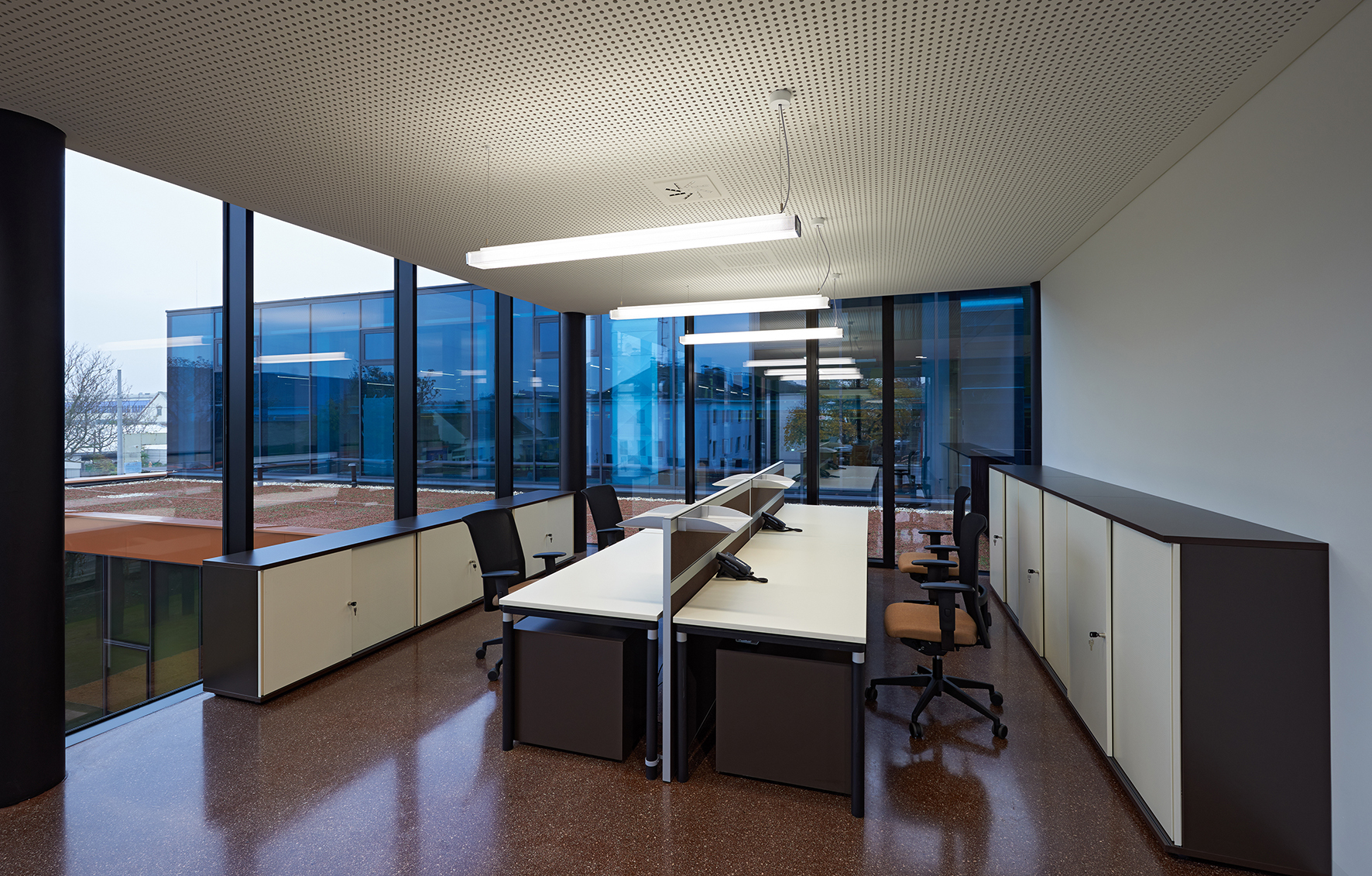 Der hohe Glasflächenanteil stellt eine Herausforderung für die Architekten dar: energieschonende Architektur trotz großflächigem Einsatz von Glas. Der Bauherr ist gelernter Betriebstechniker und hat sich gezielt für die Architekten entschieden, weil er einen Partner wollte, der ihn bei dem Vorhaben unterstützt, Energie und damit auch Kosten zu sparen. Ein erster Plan sah vor, dass das Grundwasser als Energiepuffer genutzt werden sollte. Bei genauerer Prüfung stellte sich dieser Plan als nicht machbar heraus. Der Plan B sah eine Integration des Sprinklerbeckens in den Heiz- und Kühlkreislauf vor. Die erste Reaktion der Haustechnik-Experten: Geht nicht. Eine in Auftrag gegebene Datenmodellierung kam, wie auch eine Diplomarbeit, zum Ergebnis, dass ein Sprinklerbecken als Puffer in den Energiekreislauf eingebunden werden kann. Gemeinsam mit der Photovoltaikanlage auf dem Dach und der rückgewonnenen Wärme aus dem Serverraum erreicht der Betrieb heute eine Energiedeckung von 80%. Für einen Gewerbebetrieb dieser Größenordnung – mit Kränen in der Lagerhalle und zahlreichen Büroarbeitsplätzen – ist das ein beachtliches Resultat. Das Gebäude wurde mit dem Umweltpreis 2013 ausgezeichnet. (Text: Martina Frühwirth)