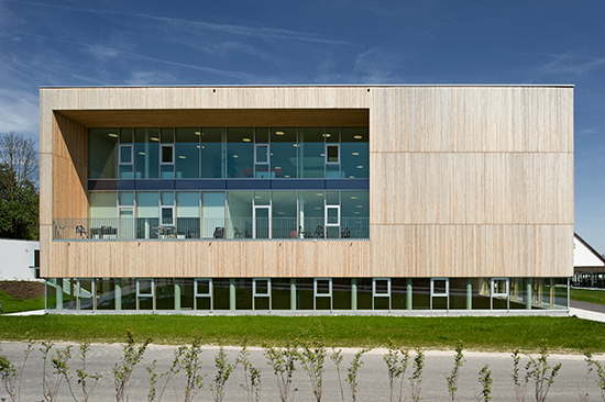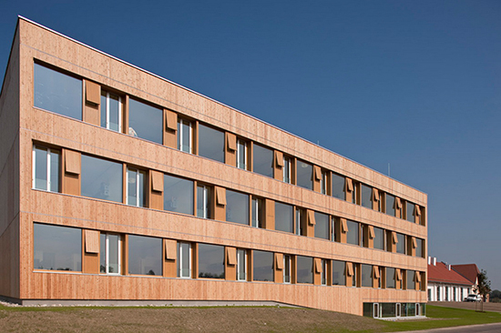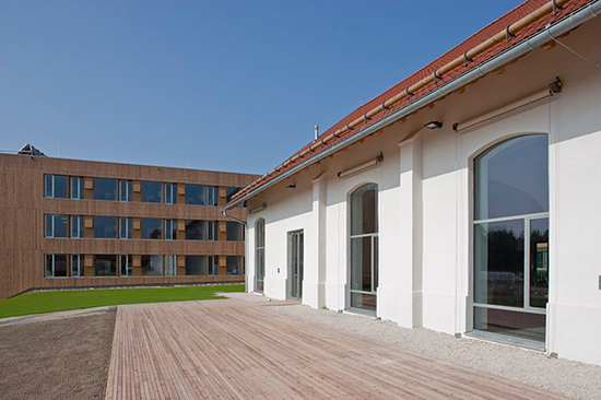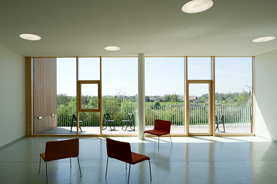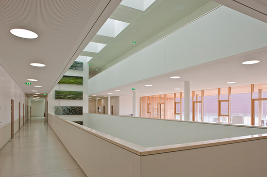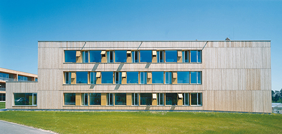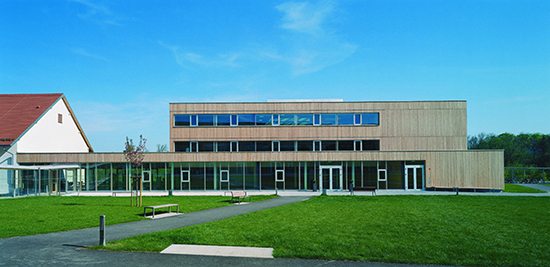Der Turnsaal der Schule befindet sich im Untergeschoss und wird durch ein umlaufendes Fensterband belichtet. Der 27 x 15 m große Saal ist vollständig mit Holz verkleidet, und ist von den Aufenthaltsflächen im Erdgeschoss der Schule aus einsehbar. Beim Internat sind die Zimmer u-förmig um einen zentralen Aufenthaltsbereich angeordnet, der sich zum Vorplatz hin öffnet und die Beziehung zum Außenraum und zum Schulgebäude herstellt. Für den Speisesaal und den Wirtschaftsbereich wurde ein denkmalgeschützter alter Stall umgebaut und adaptiert. Beheizt wird mittels Hackschnitzelheizung, die am Dach des Internatsgebäudes situierten Sonnenkollektoren versorgen die Anlage mit Warmwasser. (Text: Architekten)