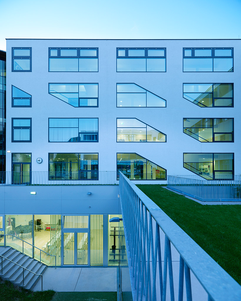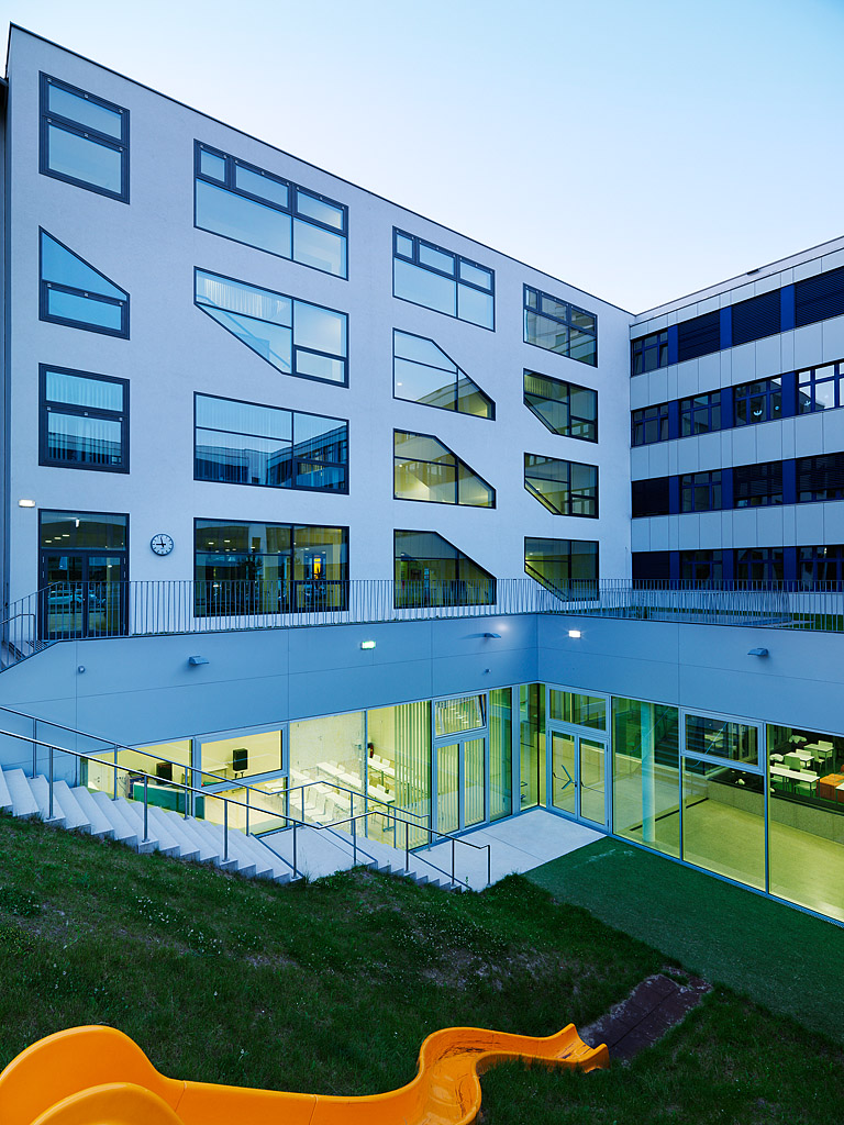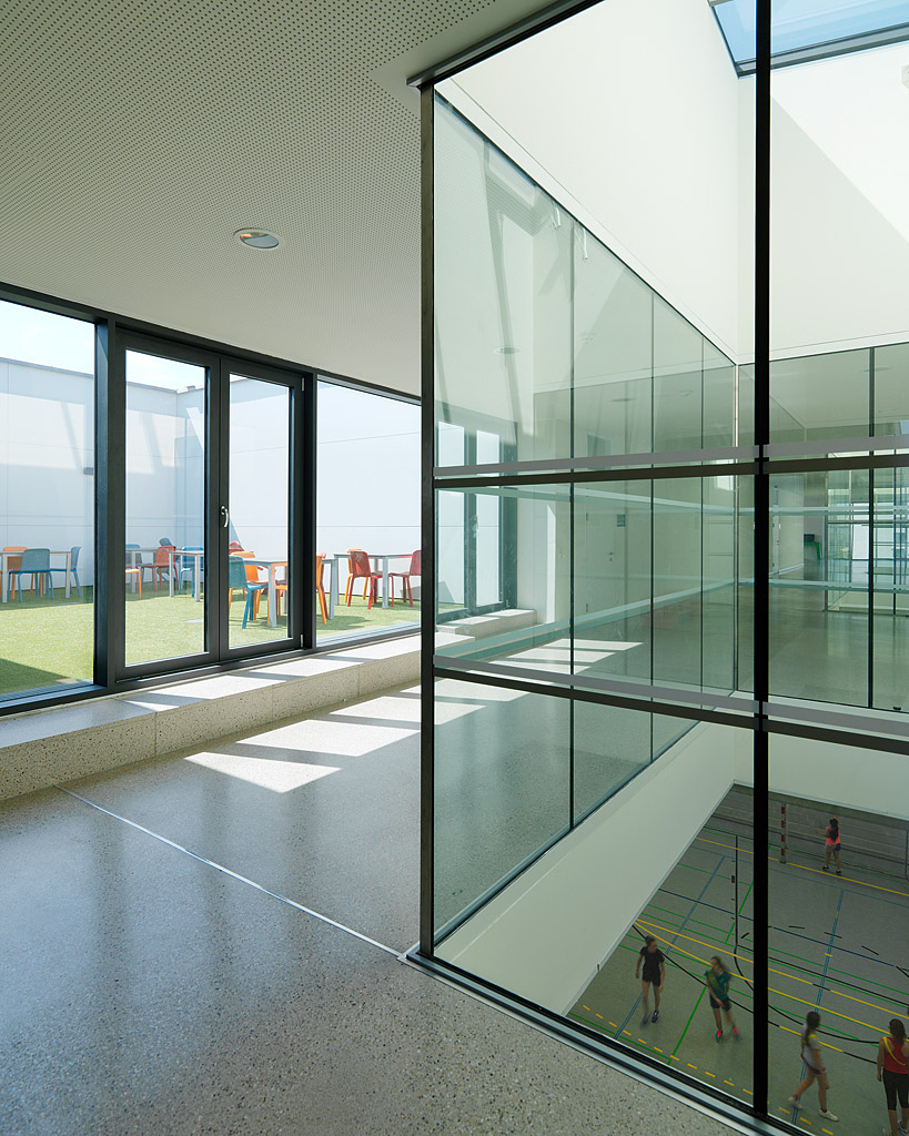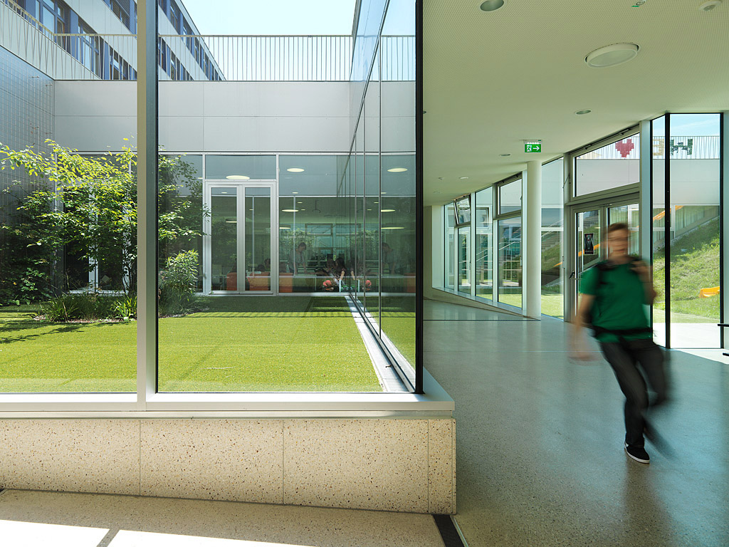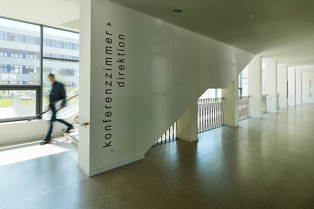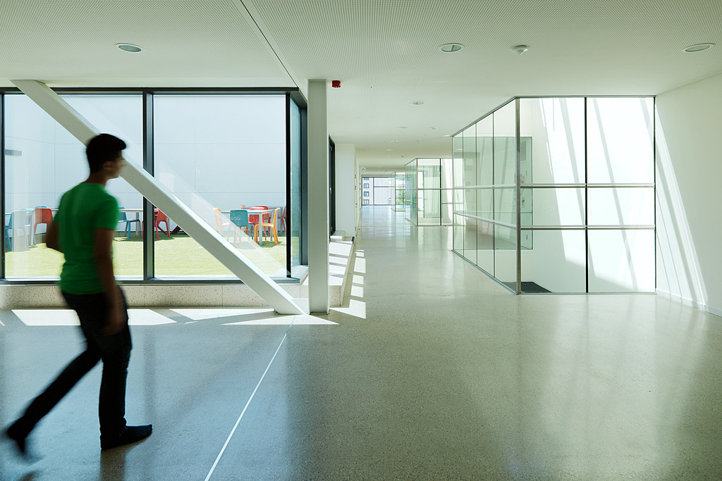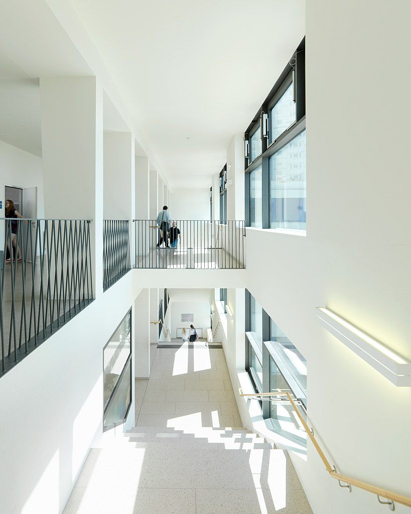 Die Erschließung dieses „Kulturbereiches“ mit Bibliothek, Musik- und Mehrzwecksälen ist über die räumlich spannende Treppe und durch eine abwechselnd von beiden Seiten über Atrien belichtete Wegeführung ein räumliches Erlebnis und bereitet auf die vielseitig nutzbaren und introvertiert angelegten Räume dieser Ebene vor. Die Schnittstelle zur Öffentlichkeit ist auf diese Weise geschickt und großzügig von den internen Nutzungen der Schule entflochten und gibt der Schule ein prägendes und aus der räumlichen Komplexität hergeleitetes, Identität stiftendes Element.