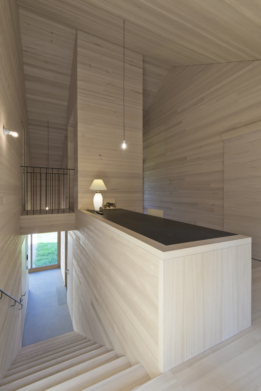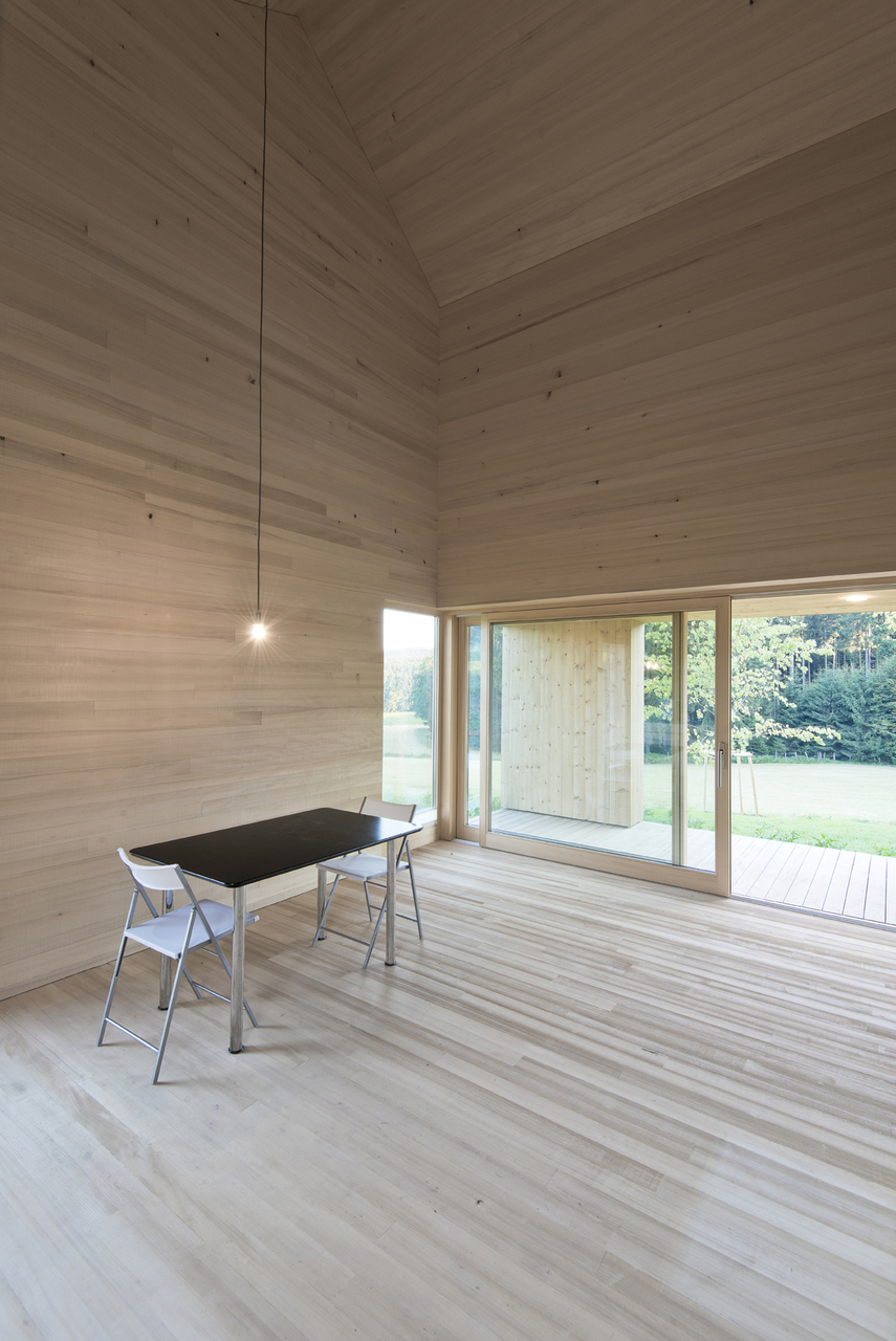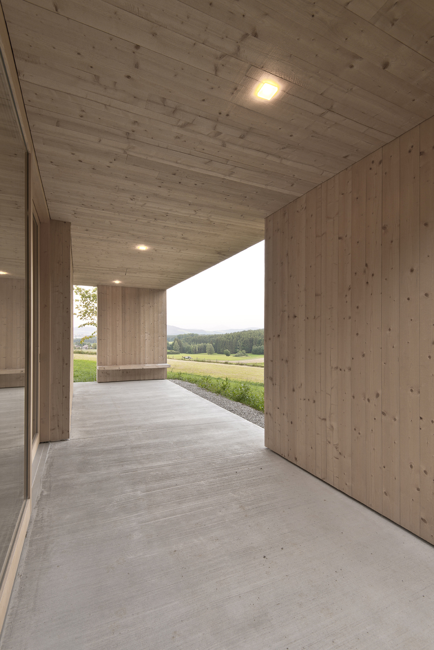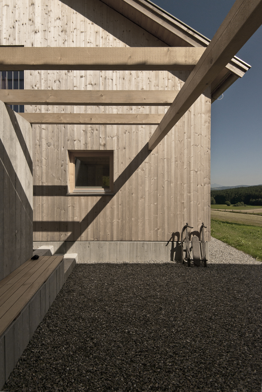 Der Naturraum im Umfeld bedarf keiner gestalterischen Änderungen, vielmehr sollen additive Elemente wie ein Brunnen an der Vorfahrt und bewusst bepflanzte Bäume einen Mehrwert schaffen. Das Ensemble aus Haupt- und Nebenbaukörper soll seinem Umfeld entsprechen und unprätentiös seinen Platz im gewachsenen Umfeld finden. Auf einem massiven Sockel sind beide Baukörper als Holzbauten konzipiert und im Ausdruck schlicht. Die Attribute der Typologie der Wohnbauten in der Gegend: Dachneigung, Dachform und Proportion werden aufgegriffen. Sie stehen in einem spannungsvollen Verhältnis zu den großflächigen Öffnungen der Baukörper und entsprechen dem Dialog der Baukörper miteinander. Der Holzbau kombiniert die Vorteile der qualitativ hochwertigen, schlanken und hochgedämmten Holzriegelbauweise für die Außenwände mit den massiven Vorteilen der Brettsperrholzelemente