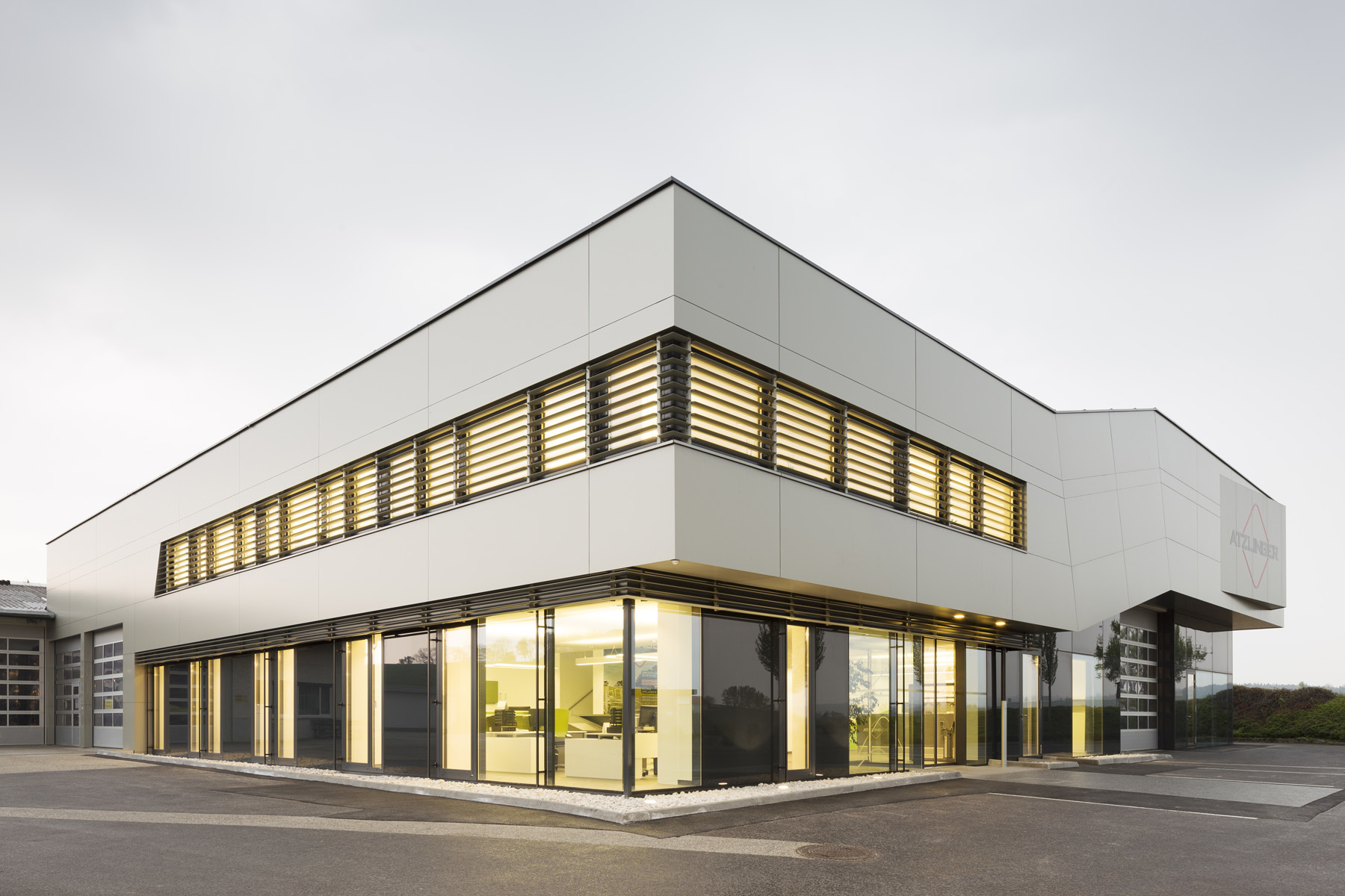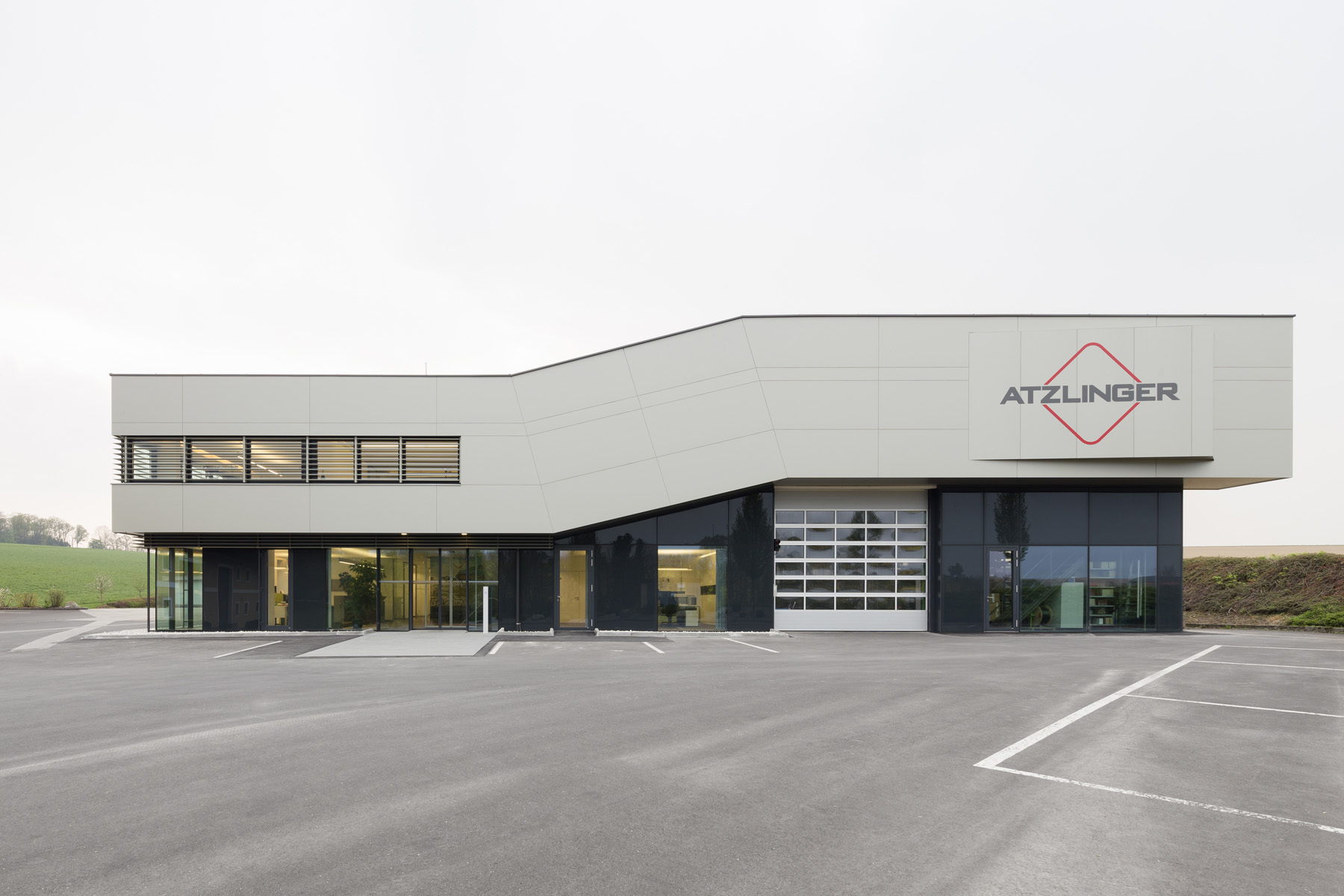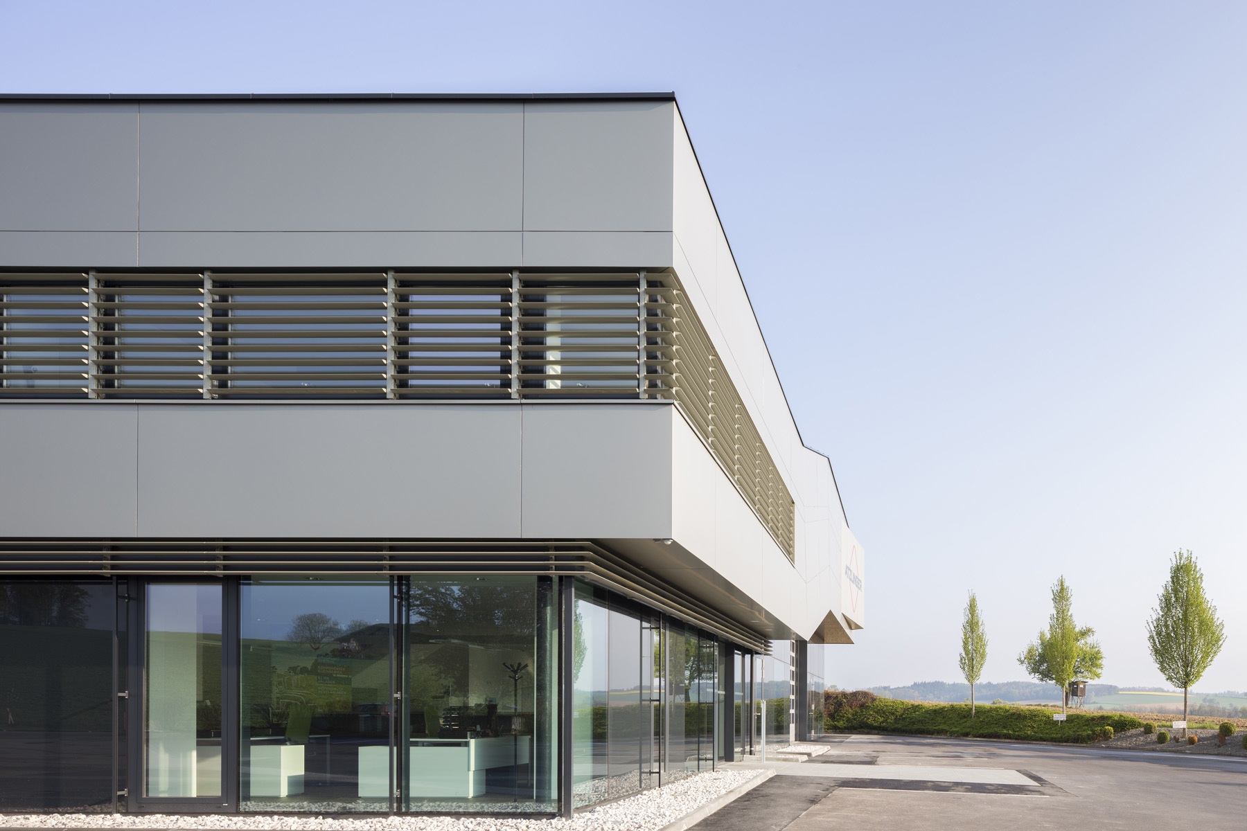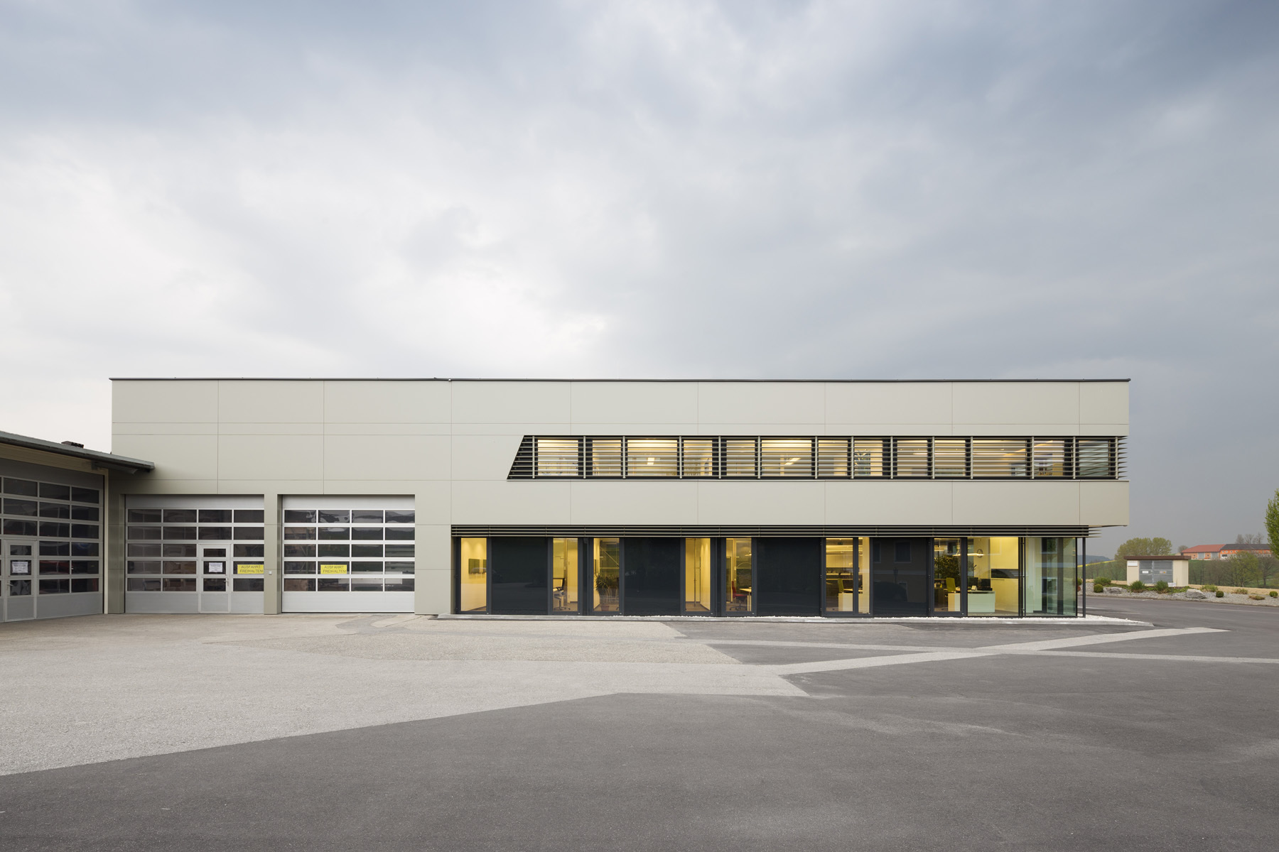 Die großzügigen Glasflächen der Fassade belichten den Innenraum und stellen einen Bezug zum ländlichen Außenraum her. Kommunikationsflächen für die Mitarbeiter wechseln sich mit Büroräumlichkeiten ab um ein ideales Arbeitsklima zu ermöglichen.