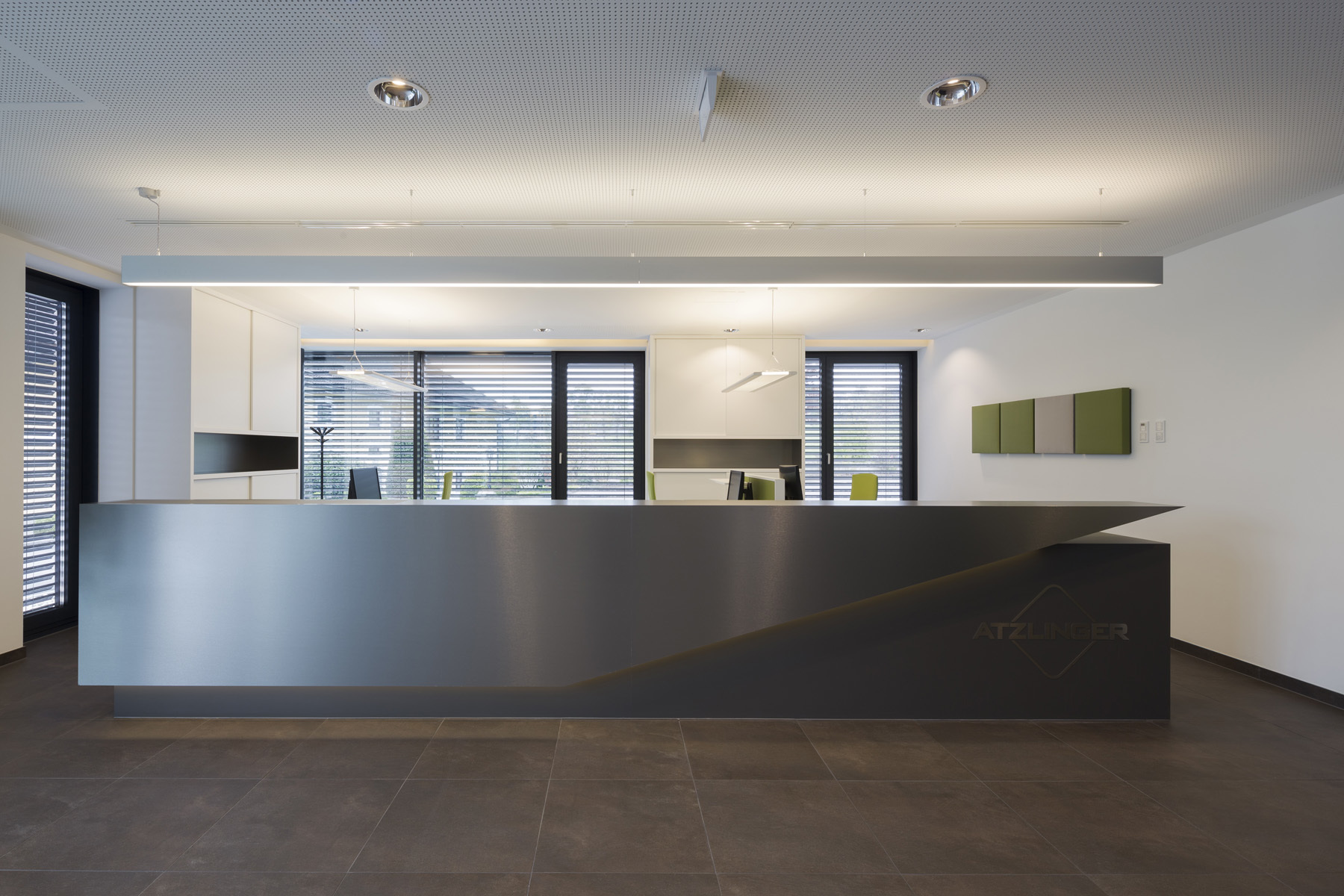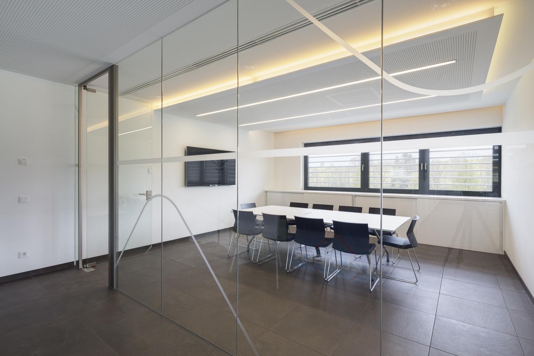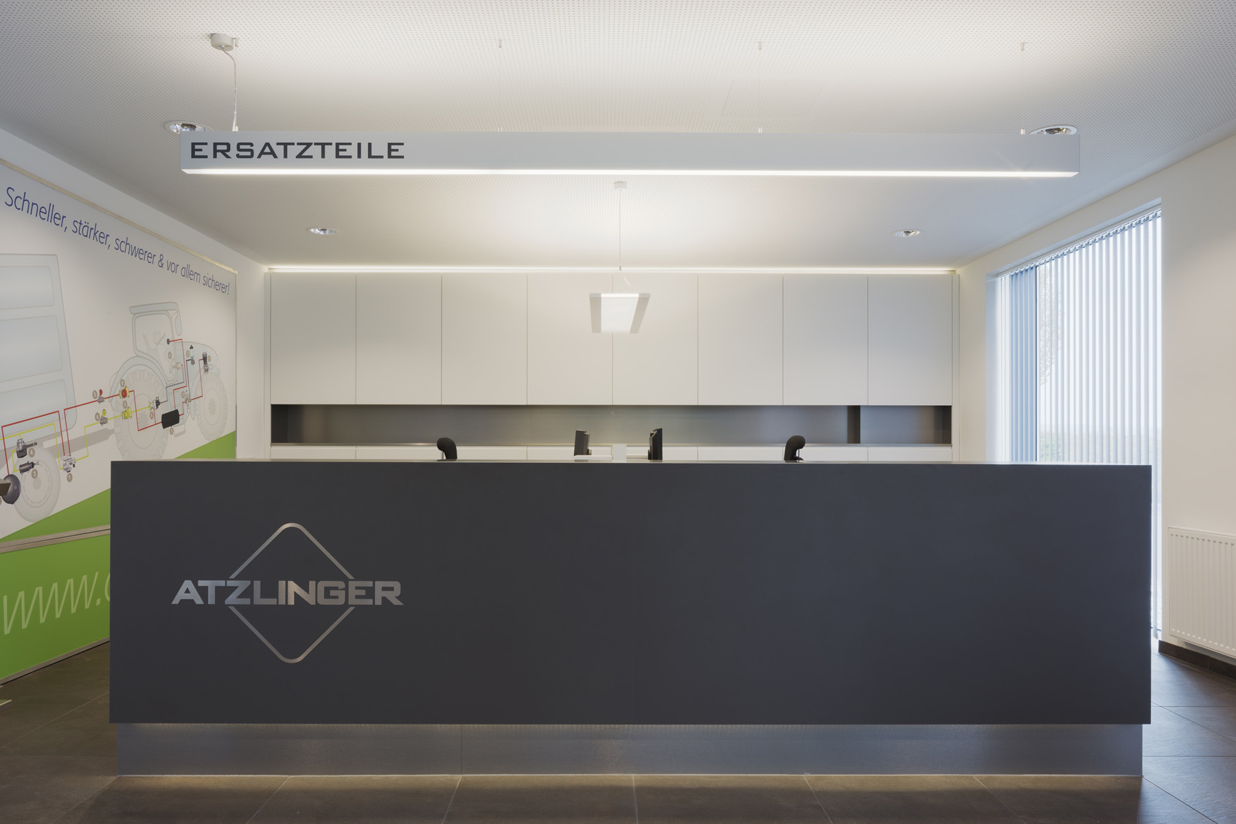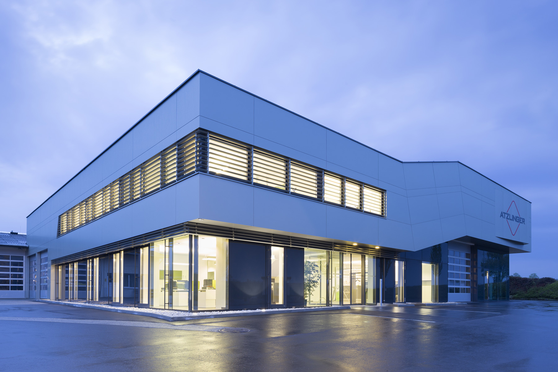Die großzügigen Glasflächen der Fassade belichten den Innenraum und stellen einen Bezug zum ländlichen Außenraum her. Kommunikationsflächen für die Mitarbeiter wechseln sich mit Büroräumlichkeiten ab um ein ideales Arbeitsklima zu ermöglichen.