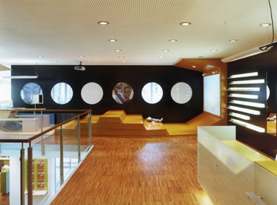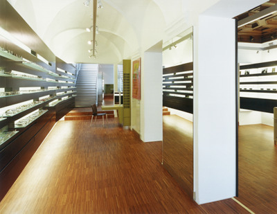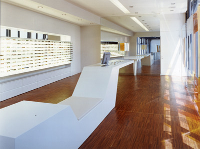 Ein Alt- und Neubau verbindendes Brillenpräsetationsband enthält alle Funktionen wie Vitrinen, Brillendisplayflächen, Screens, Spiegel, Türen, Ablageflächen etc. Im Schwarzweißkontrast treten die Farbnuancen der Brillenfassungen und -gläser deutlich hervor, während diverse Service-Korpusse durch ihre starke Farbigkeit Position beziehen. Die orange Kinderzone im Obergeschoss etwa bildet eine funktionale kindergerechte Insel im Raum. Die Tönungsnuancen von Sonnenbrillen werden an der hofseitigen Glasfront aufgegriffen, wo bei Sonneneinstrahlung farbiges Licht durch getönte Plexiglasscheiben auf die weißen Pulte fällt. Im Kontaktlinsenbereich hängt ein Spezialluster aus Abfällen der Brillenproduktion. Aber selbst solche spielerischen Elemente sind in einen Sachzusammenhang gesetzt, in dem Klarheit und Übersichtlichkeit im Dienst des zu schärfenden Sehnervs die Hauptrolle spielt. (Text: Gabriele Kaiser, 7.11.2003)
