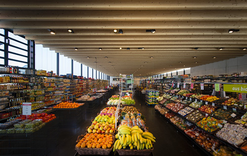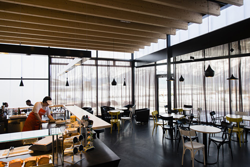 Diese Regale sind natürlich leer, im Gegensatz zu den „richtigen“, die auf dunkelbraunen Kunststoffböden stehen. Rund 500 der insgesamt 1000 Quadratmeter des Weerberger MPreises sind für den eigentlichen Supermarkt reserviert, etwa hundert für das Baguette, das sich durch eine kleine Terrasse nach außen öffnet. Die vorherrschende Farbe ist hier Schwarz bzw. die von Ahornholz. Das Mobiliar führt ein reizvolles Spiel mit Schwarz, Weiß und Gelb vor, die Lampen in drei unterschiedlichen Formen verpassen dem Café unkonventionelles Flair.