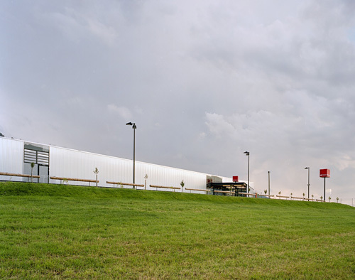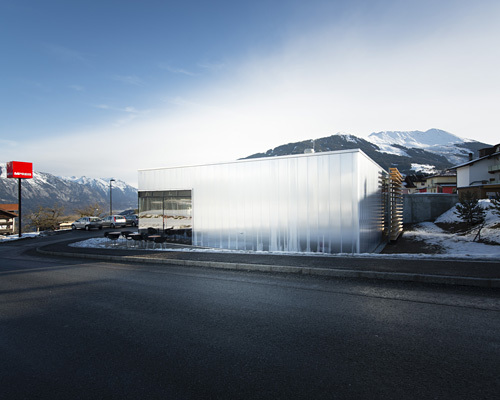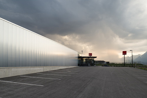 In der marokkanischen Wüste hat Silvia Boday der Auftrag ereilt, am Weerberg einen MPreis zu bauen. Der übrigens der erste von mehr als 200 Lebensmittelmärkten ist, der allein von einer Architektin geplant worden ist. Gebaut in nur sechs Monaten in einer – gelinde gesagt – architektonisch schwierigen Umgebung. Mit dem Vorteil für Silvia Boday, formal auf diese nicht Rücksicht nehmen zu müssen, um einen transluzenten, extrem langen Container auf der sanft abfallenden grünen Wiese aufzustellen.Die Geradlinigkeit dieser 54 Meter langen und 14 Meter breiten, schlichten, silbrig glänzenden Kiste wird durch Zubauten geschickt aufgebrochen, die aus den westlichen bzw. östlichen Rändern des Baukörpers wie herausgeklappt erscheinen. Um etwa den Eingang zu markieren, der als verglastes, unübersehbar dunkel gerahmtes Element mit dreieckigem Grundriss die Fassade durchsticht. Die Gebäudeteile, die am anderen Ende aus dem Container aus der Achse verdreht herauswachsen, sind zwar wesentlich größer, allerdings unscheinbarer. Sind sie doch, genauso wie der Sockel, auf dem das gesamte Gebäude steht, in Sichtbeton ausgeführt, was diesen für Lager- bzw. Personalräume notwendigen „Nebenbauten“ fast die Anmutung einer Industriehalle verleiht.