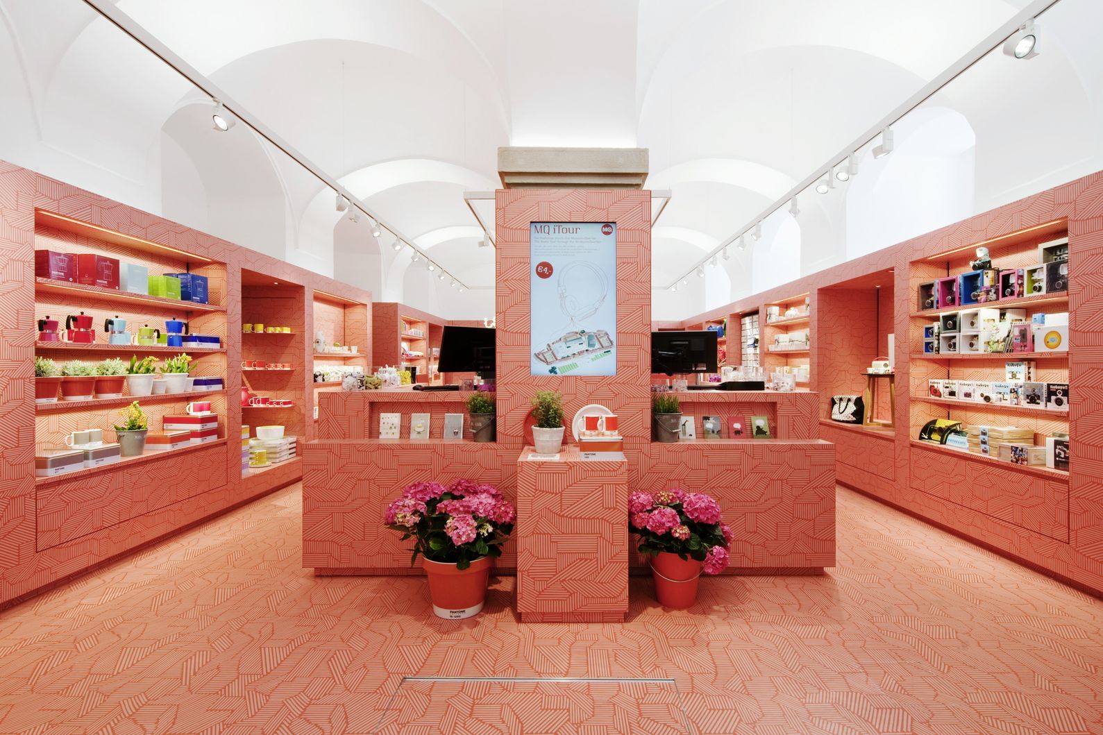 Die eine Farbe ist orange-rot. Der Farbeindruck ist im Vergleich zum leuchtend orange-roten Auftritt der MQ–CI weniger laut. Der helle Farbton des „digitalen Pinselstrichs“ erinnert an eine legendäre Farbe aus der Kindheit, „010 Fleischfarbe“, einen Buntstift der Marke Jolly. Auf den ersten Blick scheint das Muster gänzlich abstrakt zu sein. Beim zweiten Blick kann man darin jedoch die Design-Ikone des MQs, das „Enzi“ erkennen. Die Oberflächen sind – von wenigen Ausnahmen wie Wandboards und Steckdosenfassungen abgesehen – durchwegs matt. Trotz aller künstlerischer Überlagerungen bleibt der MQ Point eine produktive, funktionierende Verkaufsmaschine. Auf kleinem Raum wurde eine klare Orientierung für Kunden und Mitarbeiter geschaffen.