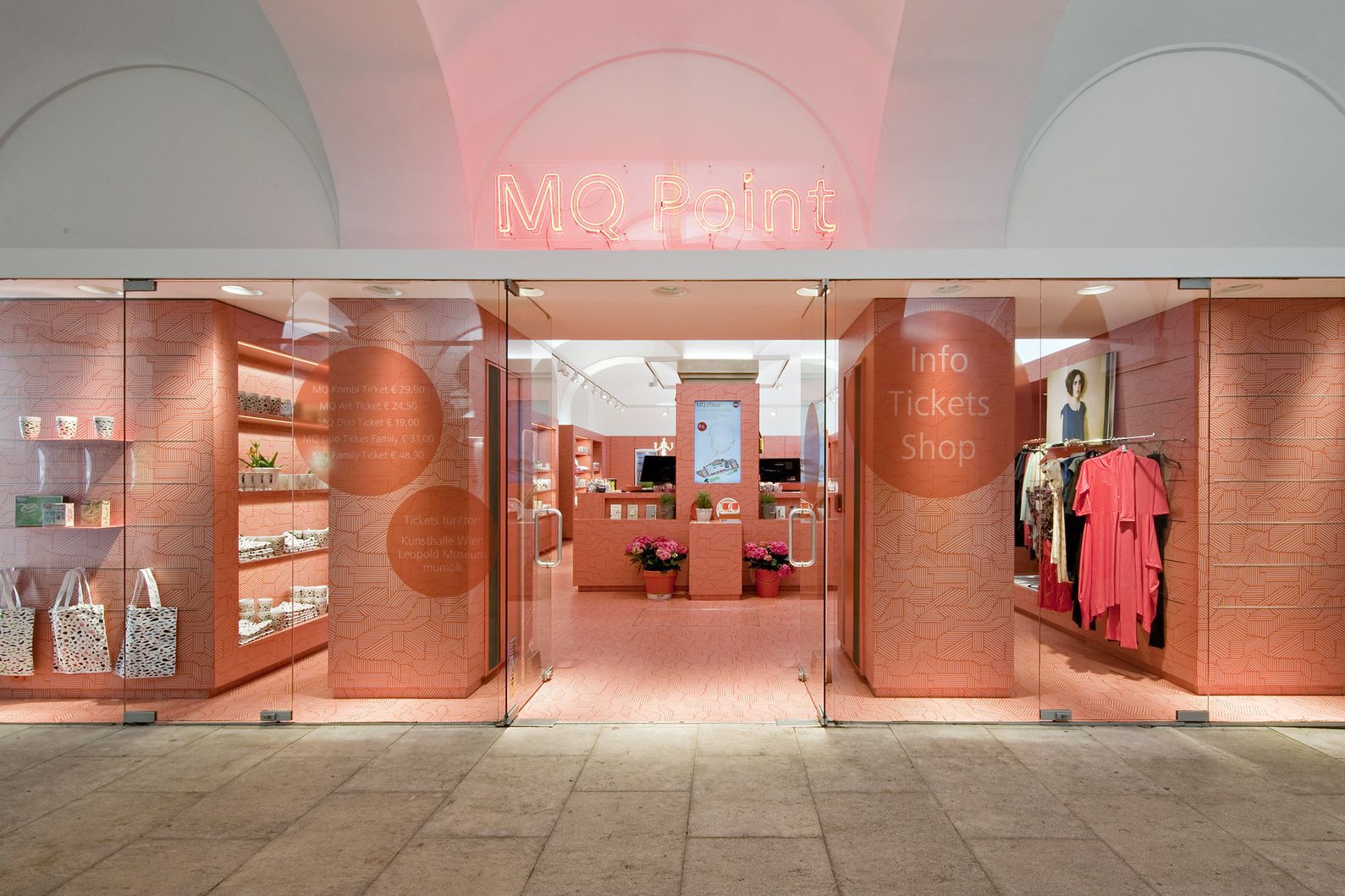Der MQ Point verfügt über zwei Eingänge. Einen vis à vis von der Pförtnerloge im Hauptdurchgang und einen in der „Electric Avenue“, jener Passage, die durch das quartier 21 führt. Hier hat der Shop zusätzlich an Präsenz gewonnen, indem die Fenster mit einer fetten Rahmung, die in den Gang hineinragt, ausgestattet wurden. Selbstverständlich in der orange-roten CI ausgeführt.