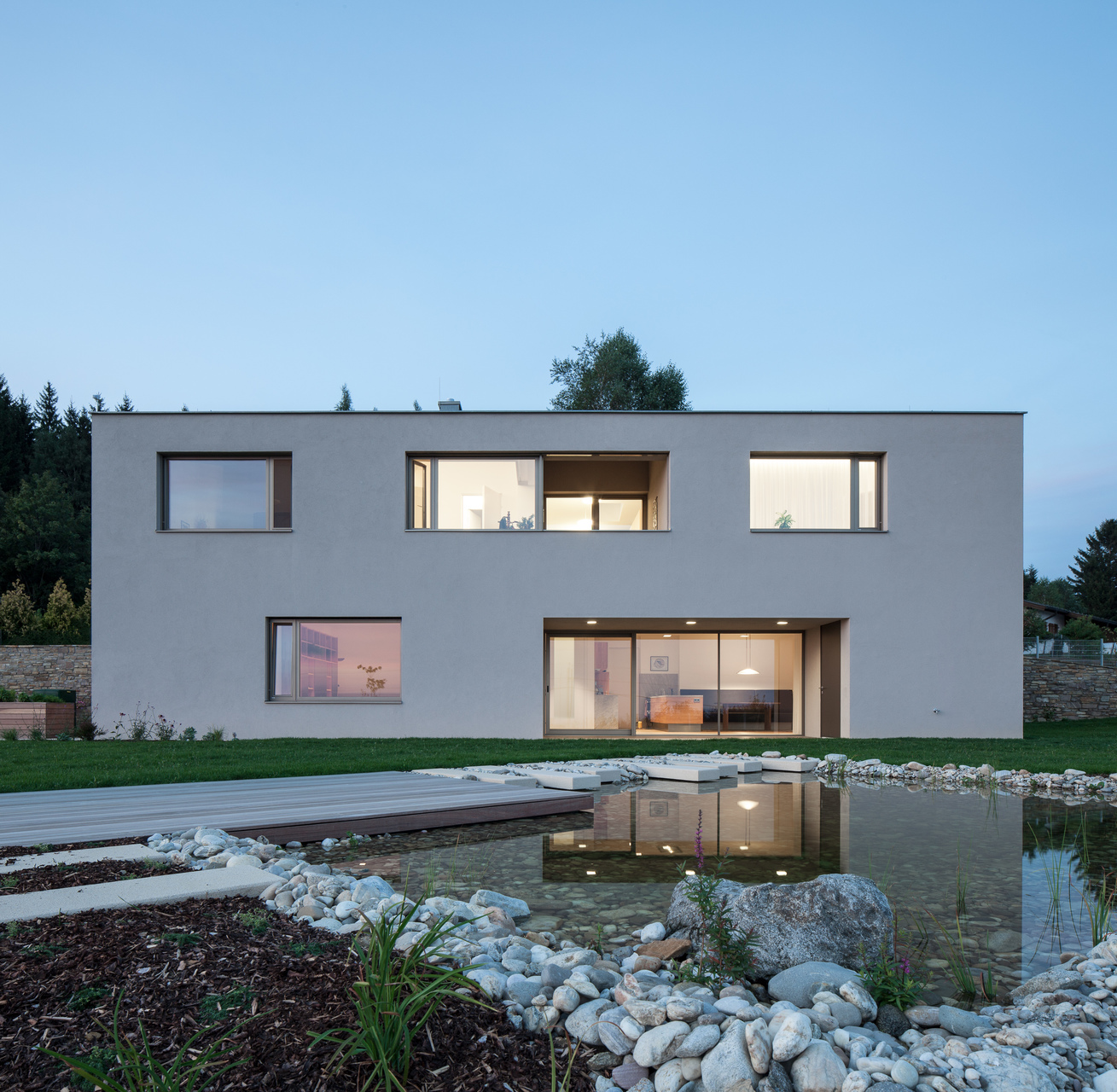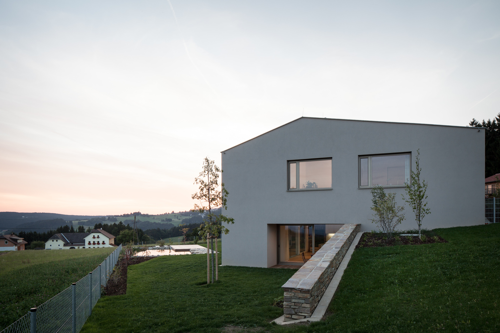 Auf einem nach Süden geneigten Hanggrundstück einer Streusiedlung beherbergt der einfach geschnittene Baukörper im Untergeschoß die Wohnräume, im Obergeschoß Schlafzimmer und Arbeitsräume des Bauherrn. Das Obergeschoß ist von der nordseitig verlaufenden Gemeindestraße her erschlossen. Das Untergeschoß öffnet sich nach Osten zur Morgensonne hin sowie Richtung Süden, hin zu einem großzügig angelegten Garten samt Schwimmteich.